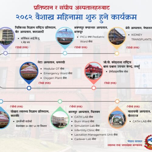 भक्तपुर क्यान्सर अस्पतालले पिआइसीयु तथा पेडियाट्रिक वार्ड वैशाख दोस्रो साता आरम्भ गर्ने भएको छ, भने भेरी अस्पतालले मिर्गाैला प्रत्यारोपण सेवा वैशाख दोस्रो साताबाट सुरू गर्ने कार्यक्रम सार्वजनिक गरेको छ ।