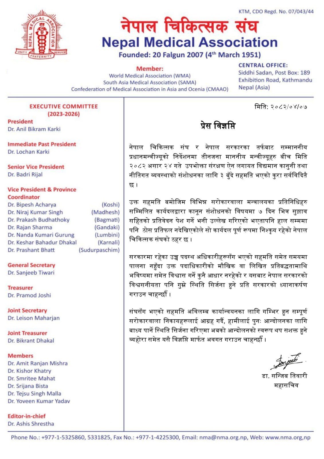 गत असार २४ गते प्रधानमन्त्रीको निर्देशनमा नेपाल चिकित्सक संघ र सरकारका तर्फबाट तीनजना मन्त्रीहरूबीच उपभोक्ता संरक्षण ऐनलगायत विद्यमान कानुनी तथा नीतिगत व्यवस्थाको संशोधनका लागि ३ बुँदे सहमति भएको थियो ।