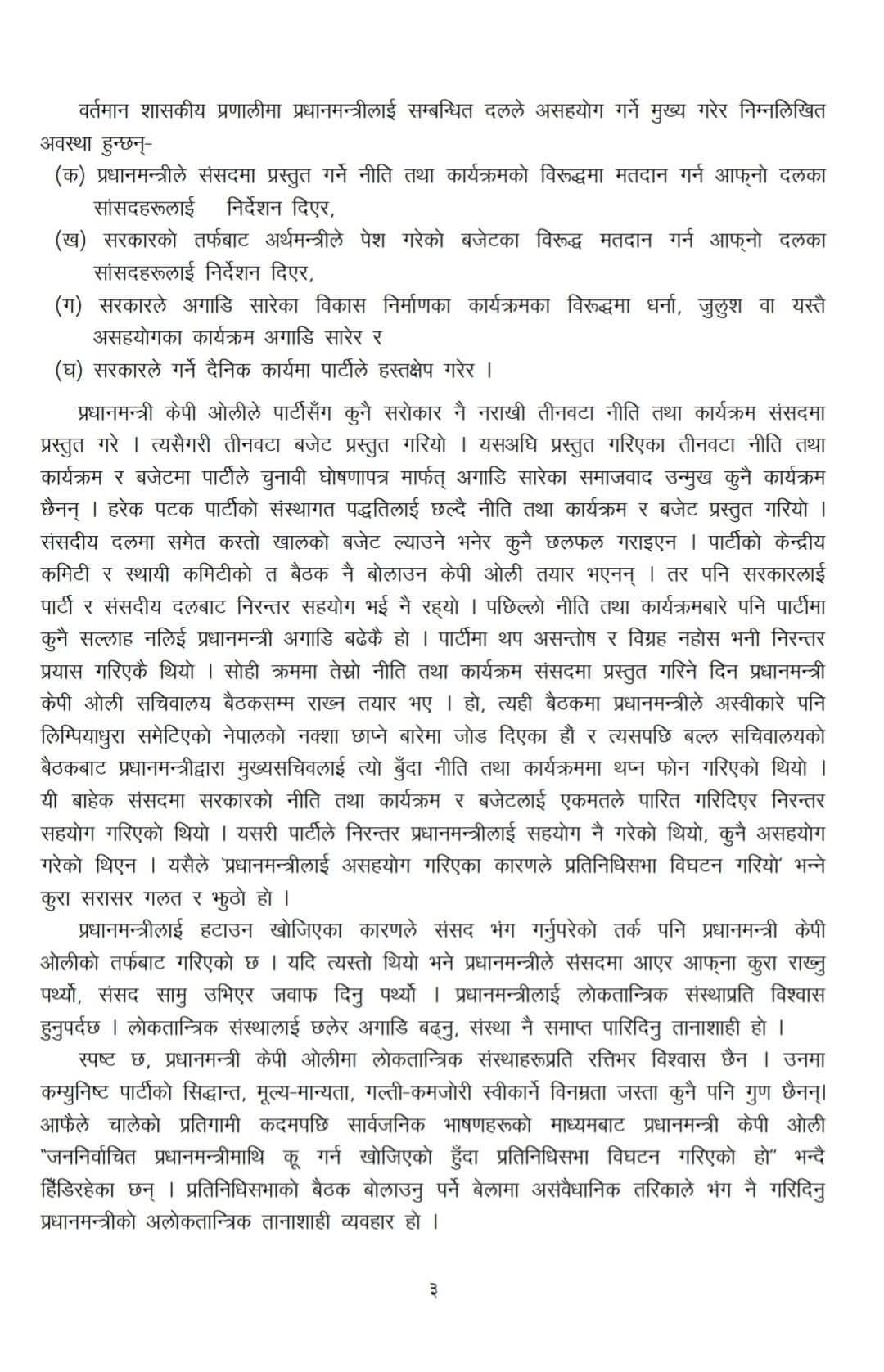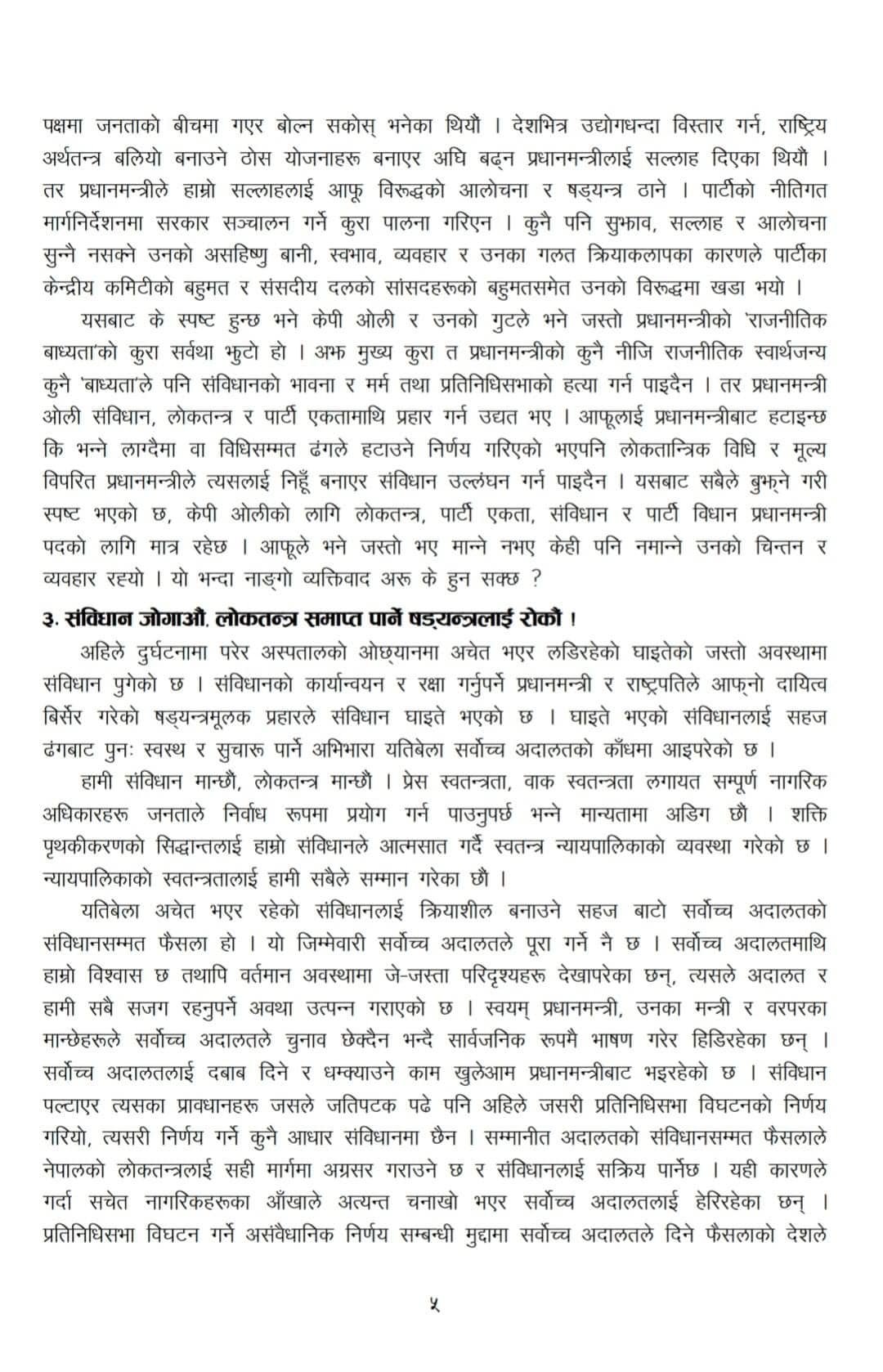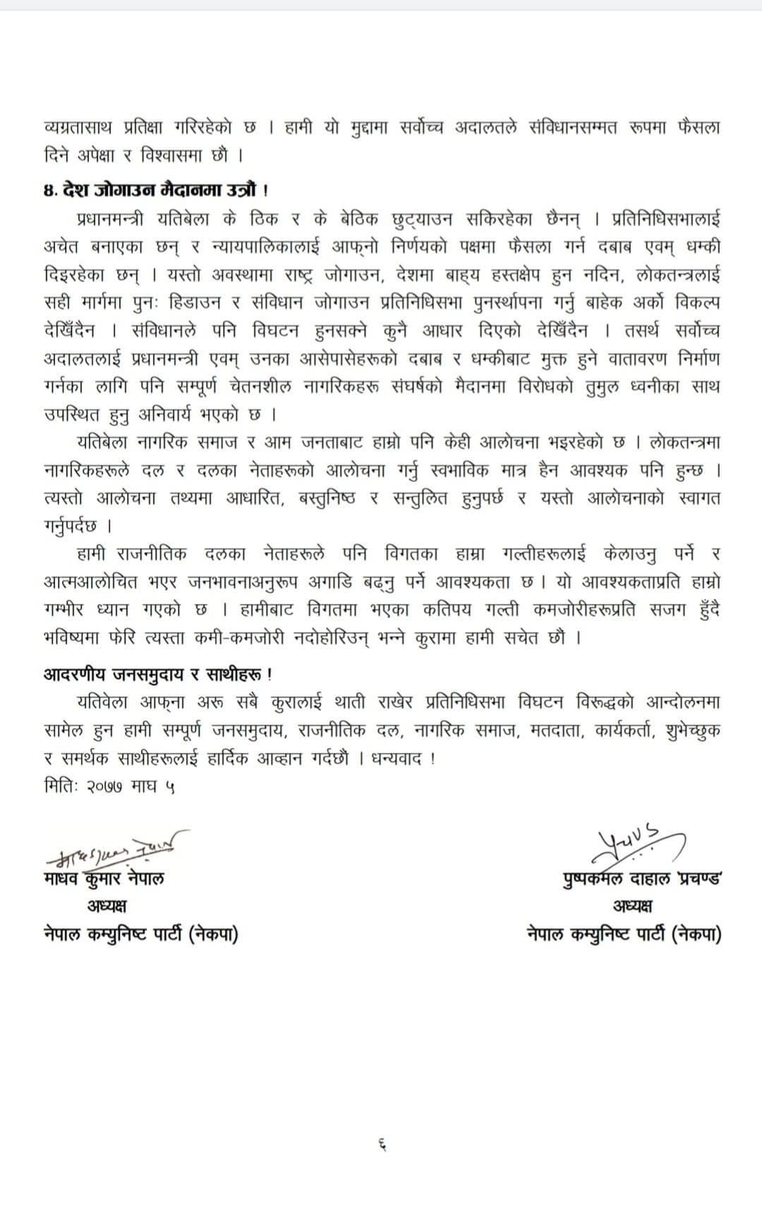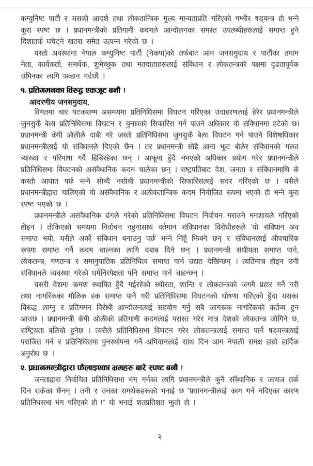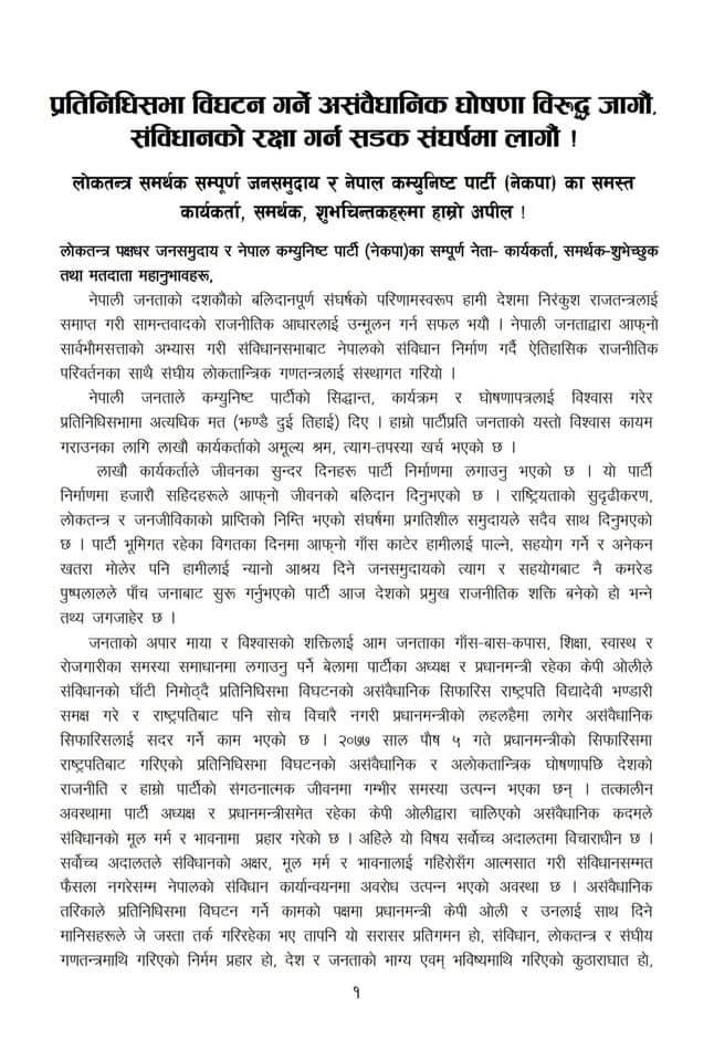 अपीलमा भनिएको छ, ‘प्रधानमन्त्री यतिबेला के ठिक र के बेठिक छुट्याउन सकिरहेका छैनन् । प्रतिनिधिसभालाई अचेत बनाएका छन् र न्यायपालिकालाई आफ्नो निर्णयको पक्षमा फैसला गर्न दबाब एवम् धम्की दिइरहेका छन् । यस्तो अवस्थामा राष्ट्र जोगाउन, देशमा बाह्य हस्तक्षेप हुन नदिन, लोकतन्त्रलाई सही मार्गमा पुनः हिडाउन र संविधान जोगाउन प्रतिनिधिसभा पुनस्र्थापना गर्नु बाहेक अर्को विकल्प देखिँदैन ।’