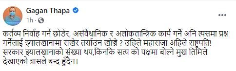 उनले लेखेका छन्, ‘कर्तव्य निर्वाह गर्न छोडेर, असंवैधानिक र अलोकतान्त्रिक कार्य गर्ने अनि त्यसमा प्रश्न गर्नेलाई झ्यालखानामा राखेर तर्साउन खोज्ने ? उहिले महाराजा अहिले राष्ट्रपति ! सरकार झ्यालखानाको संख्या थप, किनकि सत्यको पक्षमा बोल्ने मुख तिमीले देखाएको त्रासले बन्द हुँदैन।’