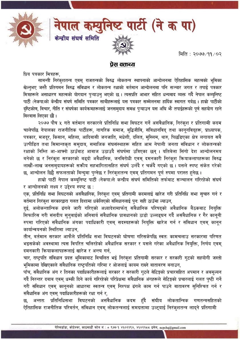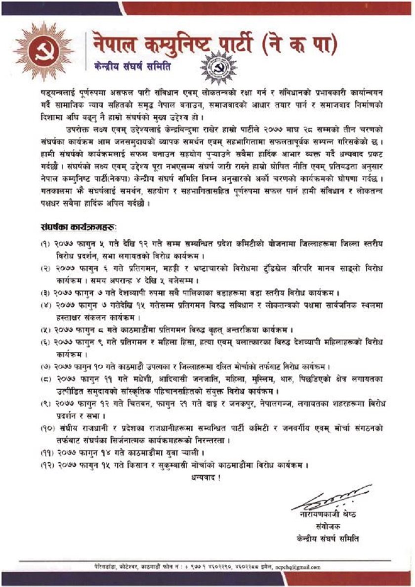 फागुन १२ गते चितवन, फागुन २१ गते दाङ्ग र जनकपुर, नेपालगञ्ज, लगायतका शहरहरूमा विरोध प्रदर्शन र सभा र संघीय राजधानी र प्रदेशका राजधानीहरूमा सम्बन्धित पार्टी कमिटी र जनवर्गीय एवम् मोर्चा संगठनको तर्फबाट संघर्षका सिर्जनात्मक कार्यक्रमहरूको निरन्तरता दिइने नेता योगेश भट्टराईले जानकारी दिए । प्रधानमन्त्री केपी शर्मा ओलीले प्रतिनिधिसभा विघटन गरेपछि प्रचण्ड–नेपाल समूह आन्दोलनमा छ ।