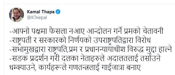 उनले लेखेका छन्, ‘आफ्नो पक्षमा फैसला नआए आन्दोलन गर्ने प्रधानमन्त्रीको चेतावनी, राष्ट्रपति र सरकारको निर्णयको उपराष्ट्रपतिद्वारा विरोध, सभामुखद्वारा राष्ट्रपति, प्रधानमन्त्री र प्रधानन्यायाधीशविरुद्ध मुद्दा हाल्ने, सडक प्रदर्शन गरी दलका नेताहरुले अदालतलाई तर्साउने धम्क्याउने, कार्यहरूले गणतन्त्रलाई गाईजात्रा बनाए ।’