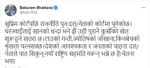 उनले लेखेका छन्, ‘सुप्रिम कोर्टपछि राजनीति पुनःदल/नेताको कोर्टमा पुगेको छ । घरज्वाईंलाई खानको धन्दा भने झैं उही पुरानै कुर्सीको खेल शुरू हुने खतरा छ । टाउको गन्ती, ज्योतिषको जोखाना, किनबेचको शृंखला चल्न सक्छ । देशको आवश्यकता र जनताको चाहना दल/नेताले पाठ सिकून्; नयाँ राष्ट्रिय सहमति गरून् भन्ने छ है ! चेतना भया !’