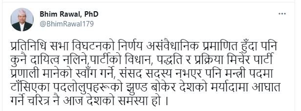 रावलले लेखेका छन्, ‘प्रतिनिधिसभा विघटनको निर्णय असंवैधानिक प्रमाणित हुँदा पनि कुनै दायित्व नलिने,पार्टीको विधान, पद्धति र प्रक्रिया मिचेर पार्टी प्रणाली मानेको स्वाङ गर्ने, संसद सदस्य नभएर पनि मन्त्री पदमा टाँसिएका पदलोलुपहरूको झुण्ड बोकेर देशको मर्यादामा आघात गर्ने चरित्र नै आज देशको समस्या हो ।’