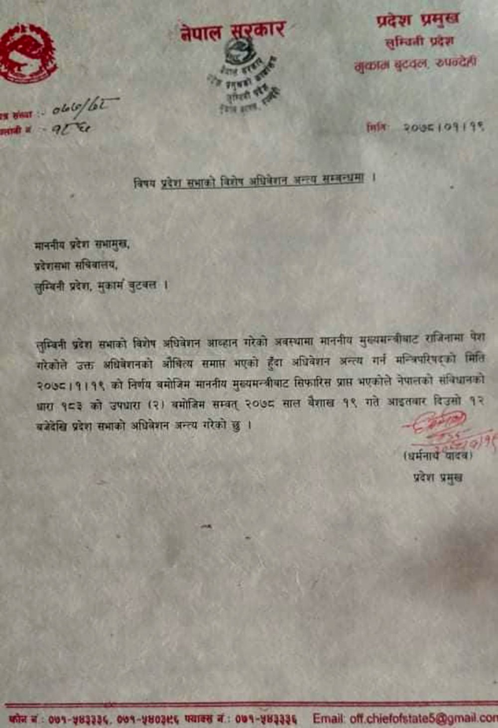 प्रदेश प्रमुखको पत्र आएपछि प्रदेश सभा सदस्यहरुले बोलाएको विशेष अधिवेशन मुख्यमन्त्रीको सिफारिसमा अन्त्य गर्ने प्रक्रिया नमिलेको भन्दै सभामुख पूर्णबहादुर घर्ती प्रदेश प्रमुखसँग छलफलका लागि गएका थिए ।