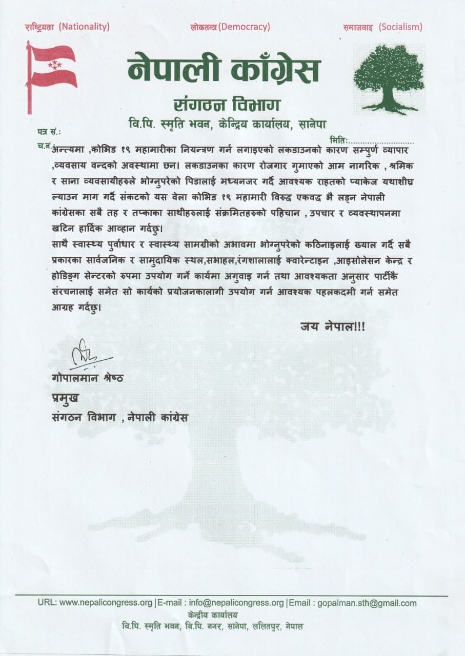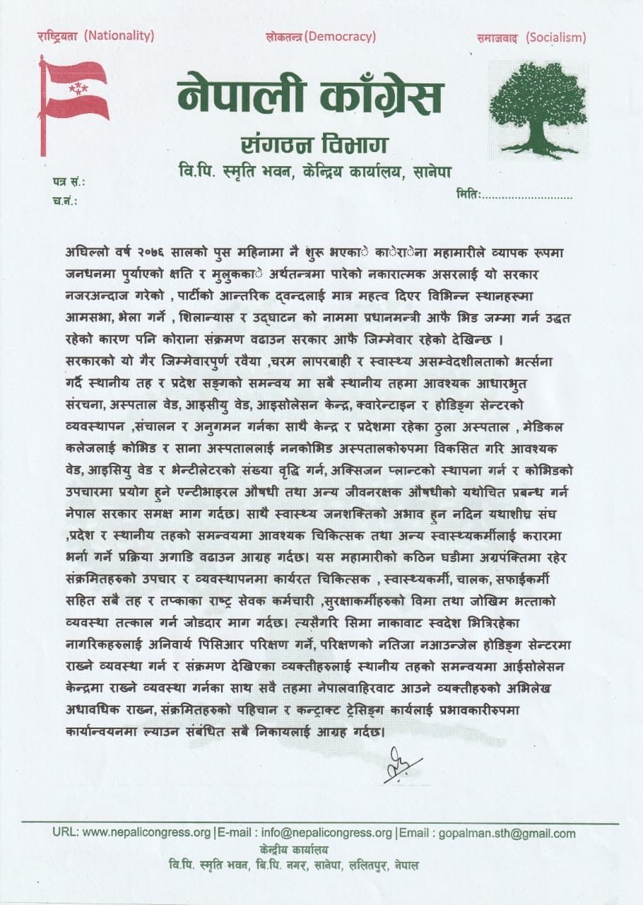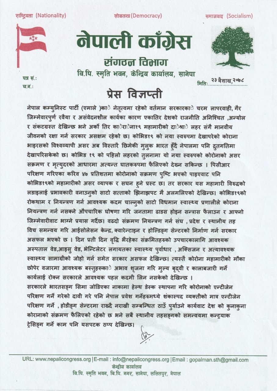 नेपाली कांग्रेसका संगठन विभाग प्रमुख गोपालमान श्रेष्ठले बिहीबार विज्ञप्ति जारी गरी सरकार महामारी रोकथाम र नियन्त्रण गर्न आवश्यक कदम चाल्नुको साटो विधमान स्वास्थ्य प्रणालीले कोराना नियन्त्रण गर्न नसक्ने औपचारिक घोषणा गरेको भन्दै आपत्ति जनाएका हुन् ।