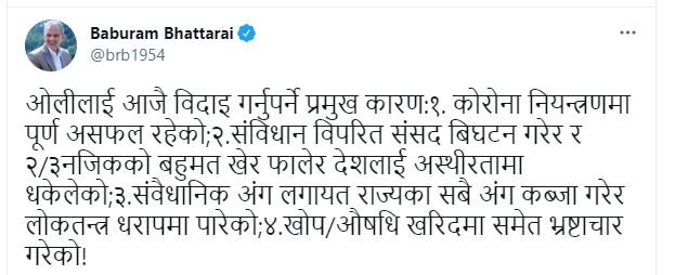 उनले लेखेका छन्, ‘ओलीलाई आजै विदाइ गर्नुपर्ने प्रमुख कारणः १. कोरोना नियन्त्रणमा पूर्ण असफल रहेको; २. संविधान विपरित संसद विघटन गरेर र २/३नजिकको बहुमत खेर फालेर देशलाई अस्थीरतामा धकेलेको, ३.संवैधानिक अंग लगायत राज्यका सबै अंग कब्जा गरेर लोकतन्त्र धरापमा पारेको; ४.खोप./औषधि खरिदमा समेत भ्रष्टाचार गरेको !’