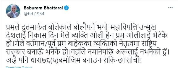 भट्टराईले लेखेका छन्, ‘प्रमले दूतमार्फत बोलेकाले बोल्नैपर्ने भयो–महाविपत्ति उन्मुख देशलाई निकास दिन मैले व्यक्ति ओली हैन प्रम ओलीलाई भेटेकै हो । मैले वर्तमान/पूर्व प्रम बाहेकका व्यक्तिको नेतृत्वमा राष्ट्रिय सरकार बनाउँ भनेकै हो । उहाँले नमानेपछि अरूलाई नभनेको हुँ । अझै पनि धारा७६(५)बमोजिम बनाउन सकिन्छ । सोचौं!’