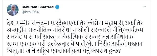 उनले लेखेका छन्, ‘देश गम्भीर संकटमा फस्दैछ । एकातिर कोरोना महामारी, अर्कोतिर अन्त्यहीन राजनीतिक गतिरोध ! न ओली सरकारले नीति/कार्यक्रम र बजेट पास गर्न सक्छ; न वैकल्पिक सरकार बन्न ! संविधानका स्तम्भ एकएक गरी ढल्दैछन् ! सबै पार्टी/नेता निरीह ! सर्पको मुखका भ्यागुता ! अनि राष्ट्रिय एकताको कुरा गर्नु अपराध हुन्छ ?’