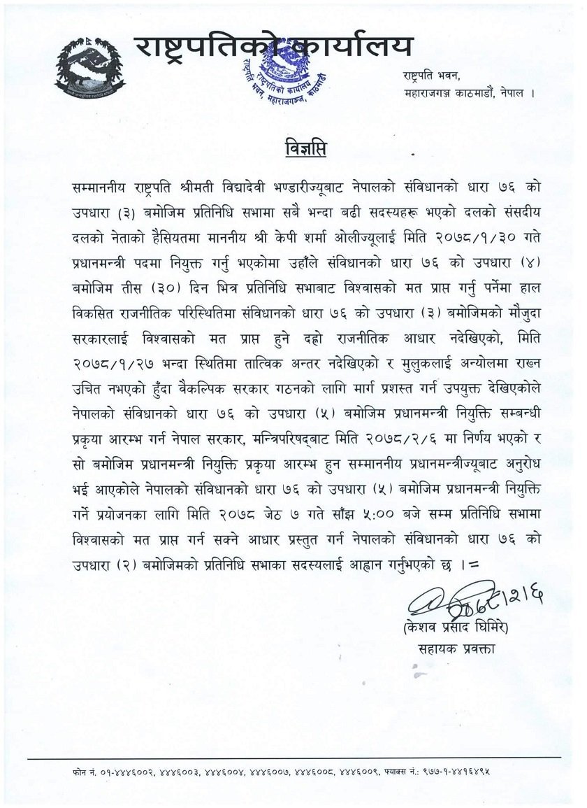 बिहीबार बसेको मन्त्रीपरिषदको बैठकले प्रधानमन्त्रीले विश्वासको मत नलिने र बैकल्पिक सरकारका लागि बाटो खुला गर्ने निर्णय गरेसँगै सरकारको सिफारिसमा राष्ट्रपतिले वैकल्पिक सरकार गठनका लागि आह्वान गरेकी हुन् ।