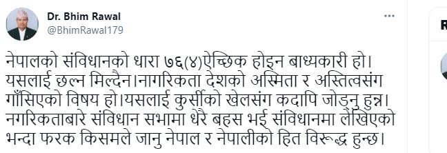 उनले लेखेका छन्, ‘नेपालको संविधानको धारा ७६(४)ऐच्छिक होइन बाध्यकारी हो । यसलाई छल्न मिल्दैन । नागरिकता देशको अस्मिता र अस्तित्वसँग गाँसिएको विषय हो । यसलाई कुर्सीको खेलसँग कदापि जोड्नु हुन्न । नगरिकताबारे संविधानसभामा धेरै बहस भई संविधानमा लेखिएको भन्दा फरक किसमले जानु नेपाल र नेपालीको हित विरूद्ध हुन्छ ।’
