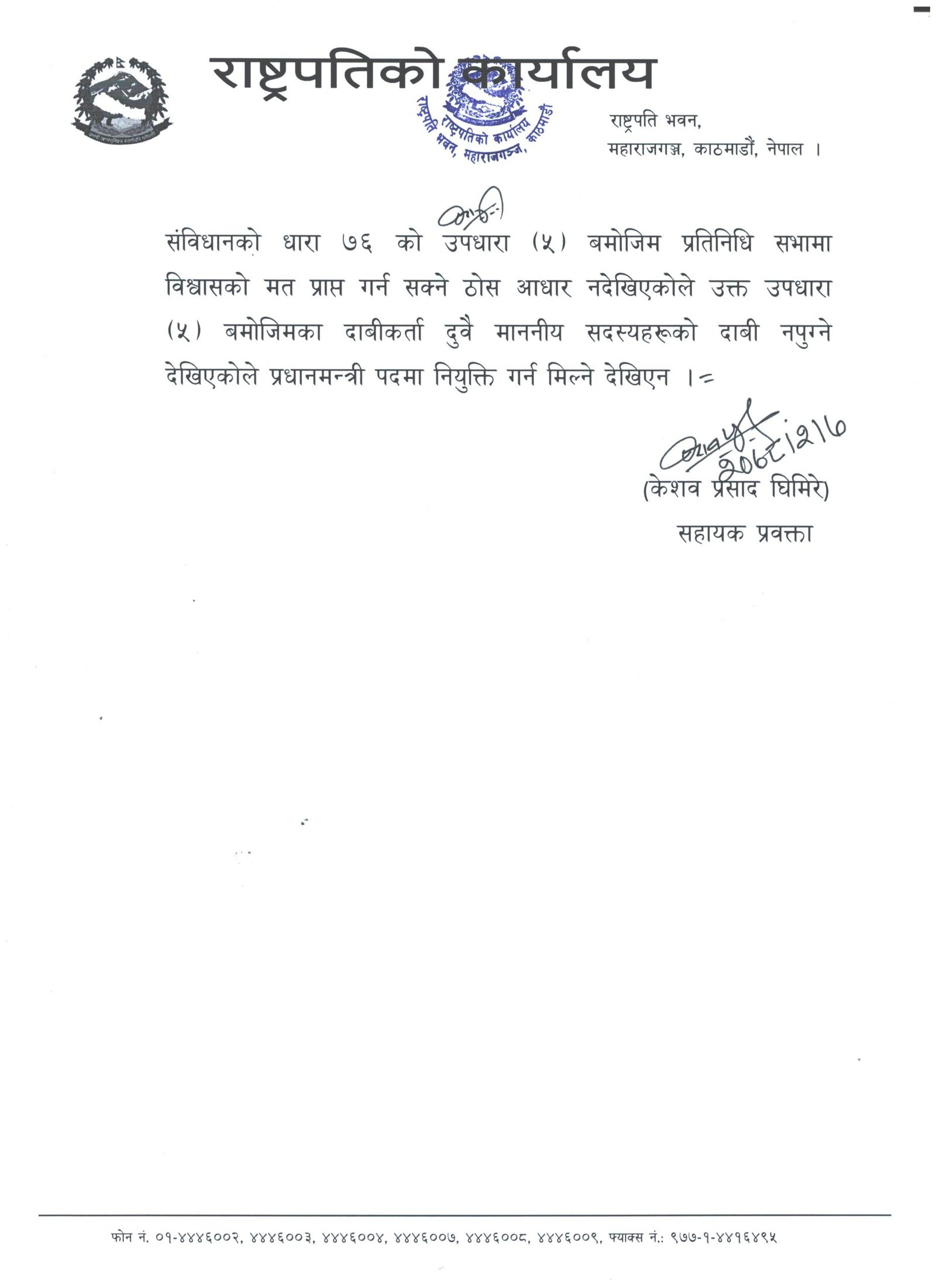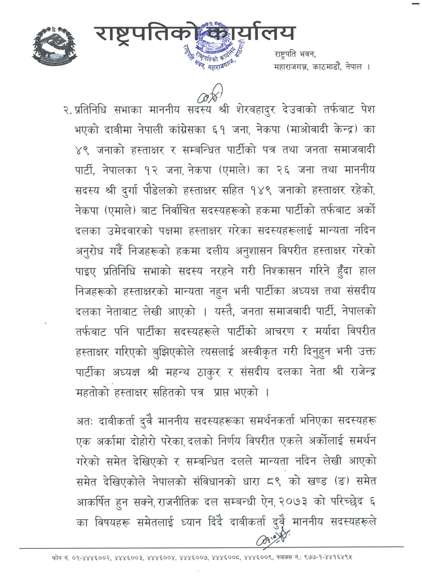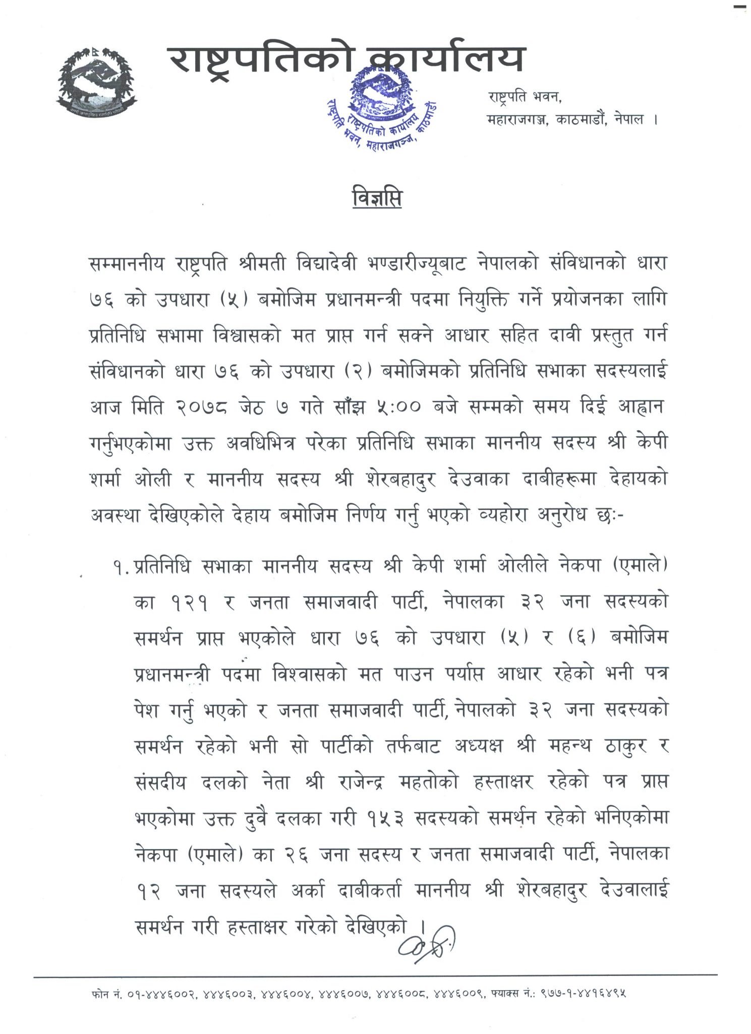 काठमाडौं । राष्ट्रपति विद्यादेवी भण्डारीले संविधानको धारा ७६ उपधारा ५ अनुसार प्रधानमन्त्रीका लागि नेकपा एमालेका अध्यक्ष केपी शर्मा ओली र कांग्रेस सभापति शेरबहादुर देउवा दुवैले पेश गरेको दाबी नपुगेको ठहर गरेकी छन् । राष्ट्रपति कार्यालयले शुक्रबार मध्यराति विज्ञप्ति जारी गरी प्रधानमन्त्रीका दुवै दाबेदारले पेश गरेको दाबीमा आधार नपुगेको जनाएको छ ।
