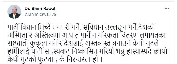 उनले लेखेका छन्, ‘पार्टी विधान मिच्दै मनपरी गर्ने, संविधान उल्लङ्घन गर्ने,देशको अस्मिता र अस्तित्वमा आघात पार्ने नागरिकता वितरण लगायतका राष्ट्रघाती कुकृत्य गर्ने र देशलाई अस्तव्यस्त बनाउने केपी गुटले हामीलाई पार्टी सदस्यबाट निष्कासित गरियो भन्नु हास्यास्पद छ । यो केपी गुटको फुटवाद कै निरन्तरता हो ।’