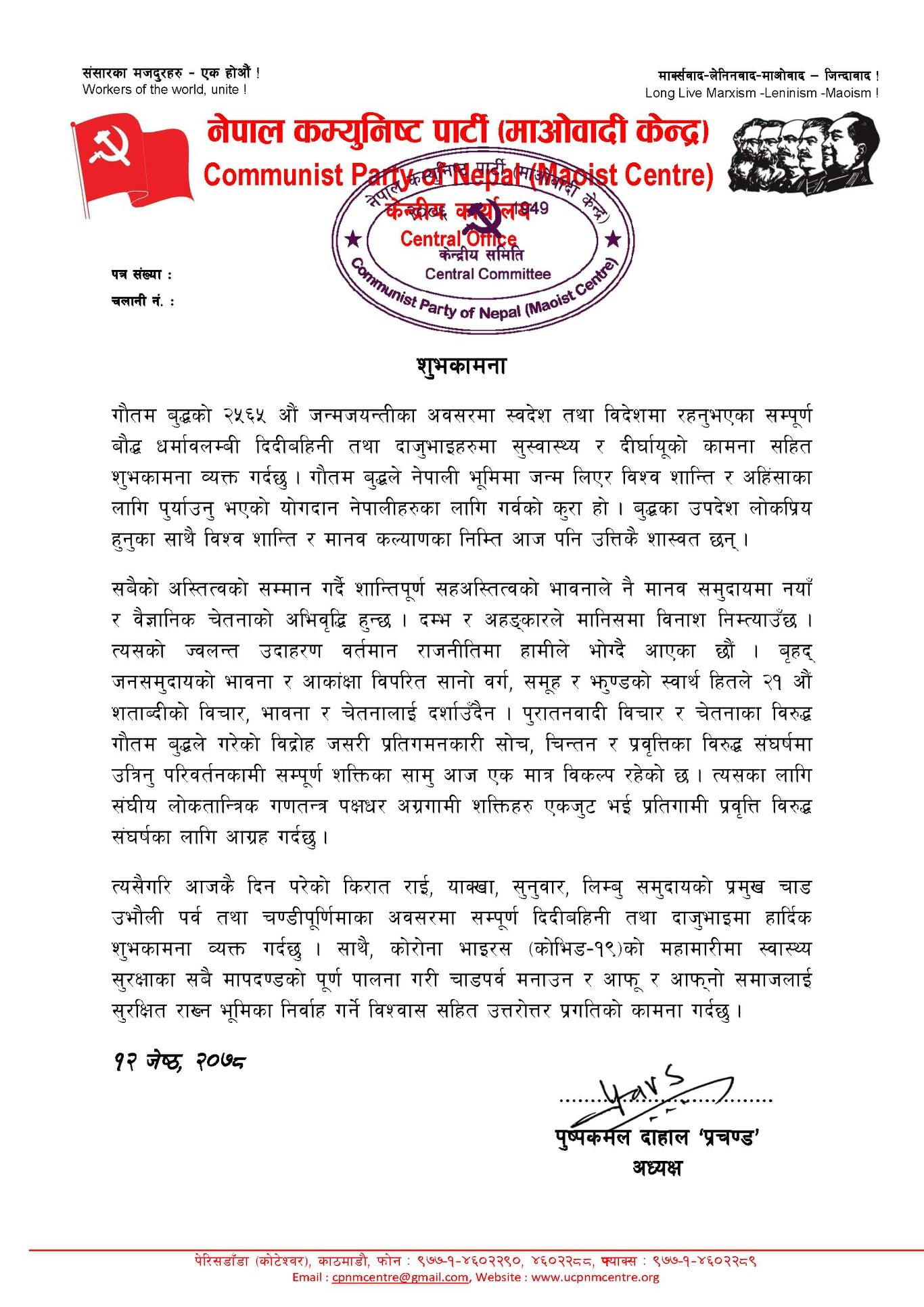 गौतम बुद्धको २५६५ औं जन्मजयन्तीका अवसरमा शुभकामना सन्देश जारी गर्दै अध्यक्ष प्रचण्डले संघीय लोकतान्त्रिक गणतन्त्र पक्षधर अग्रगामी शक्ति एकजुट भई प्रतिगामी प्रवृत्तिविरूद्ध संघर्ष गर्नुपर्ने बताएका हुन् ।