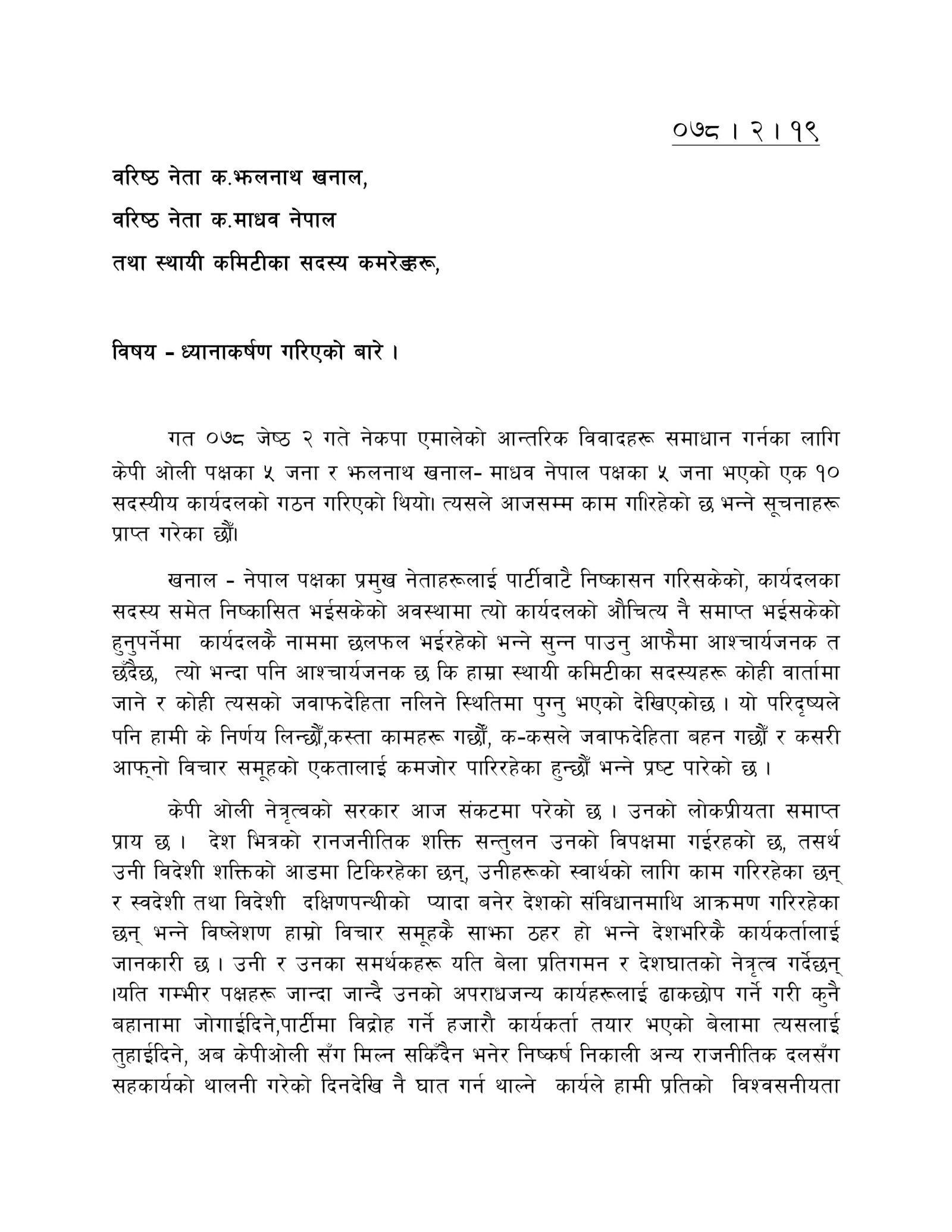 पोलिटब्यूरो सदस्य प्रकाश ज्वाला, जगन्नाथ खतिवडा, डा. विजय पौडेल र केन्द्रीय सदस्य राजेन्द्र राईले ध्यानाकर्षणपत्र बुक्राउँदै अध्यक्ष ओलीसँग सम्झौता गर्ने हो भने राजनीति समाप्त हुने चेतावनी दिएका छन् ।