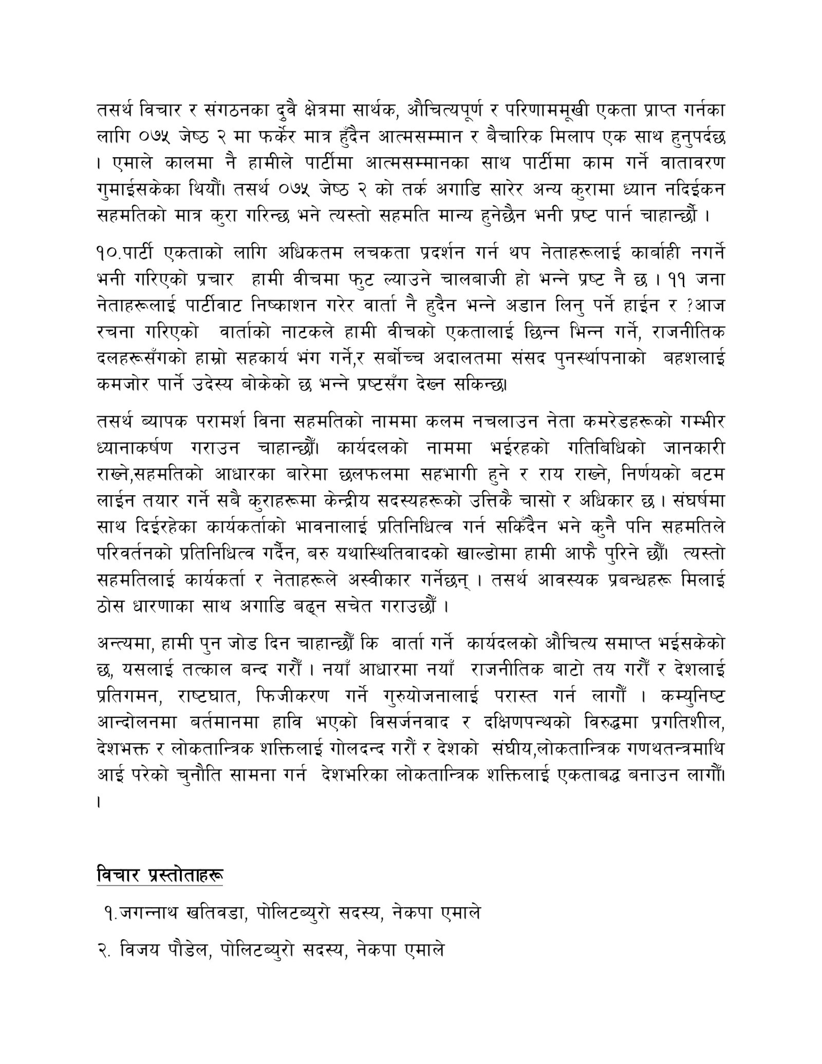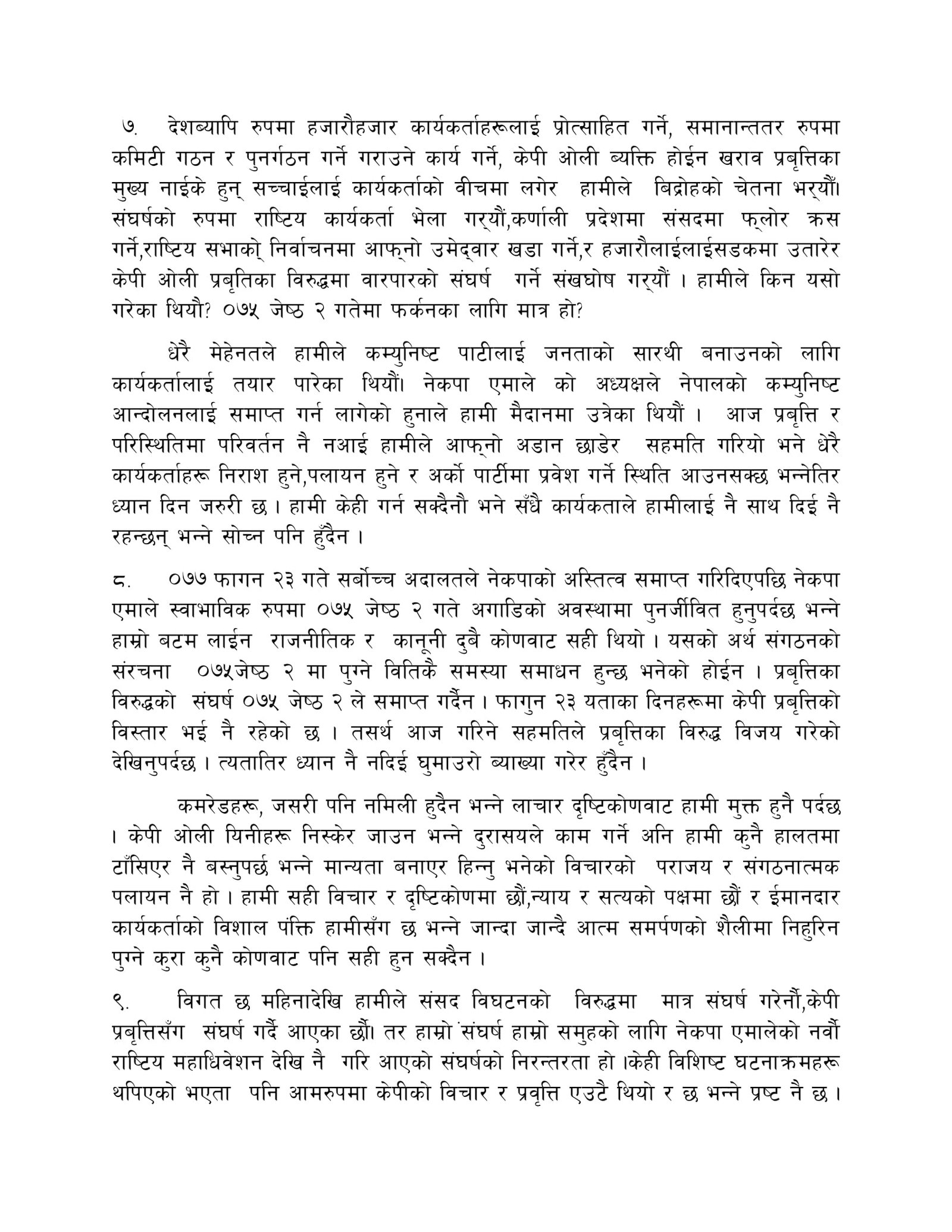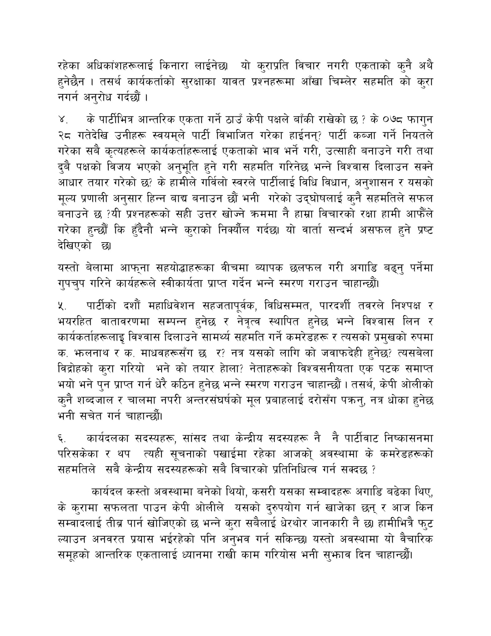 उनीहरुले ओली पक्षले प्रमुख नेताहरुलाई पार्टीबाटै निष्कासन गरिसकेको, कार्यदलका सदस्यसमेत निष्कासित भइसकेको अवस्थामा कार्यदलको औचित्य नै समाप्त भइसकेको भन्द्र कार्यदलकै नाममा छलफल भइरहेको भन्ने सुन्न पाउनु आफैंमा आश्चर्यजनक भएको बताएका छन् । स्थायी कमिटीका सदस्यहरु कोही वार्तामा जाने र कोही त्यसको जवाफदेहिता नलिने स्थितिमा पुगेको पत्रमा उल्लेख छ ।