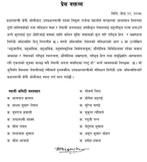 १५ नेताले महतोको संविधान विरोधी उक्त अभिव्यक्तिबारे केपी ओलीबाट स्पष्ट पार्न माग गरेका छन् । विज्ञप्तिमा भनिएको छ, ‘विगतमा टुंगो लागिसकेको तथा संविधानसभा र नेपाली जनताबाट अस्वीकृत नेपाललाई बहुराष्ट्रिय राज्य बनाउने भन्ने कुरालाई पुनः दोहोर्याई यसका लागि कथित मुक्ति संग्रामको कुरा गरी राष्ट्रिय हित र अखण्डता विरोधी अभिव्यक्ति दिनु निन्दनीय छ ।’