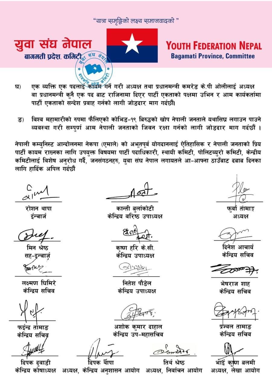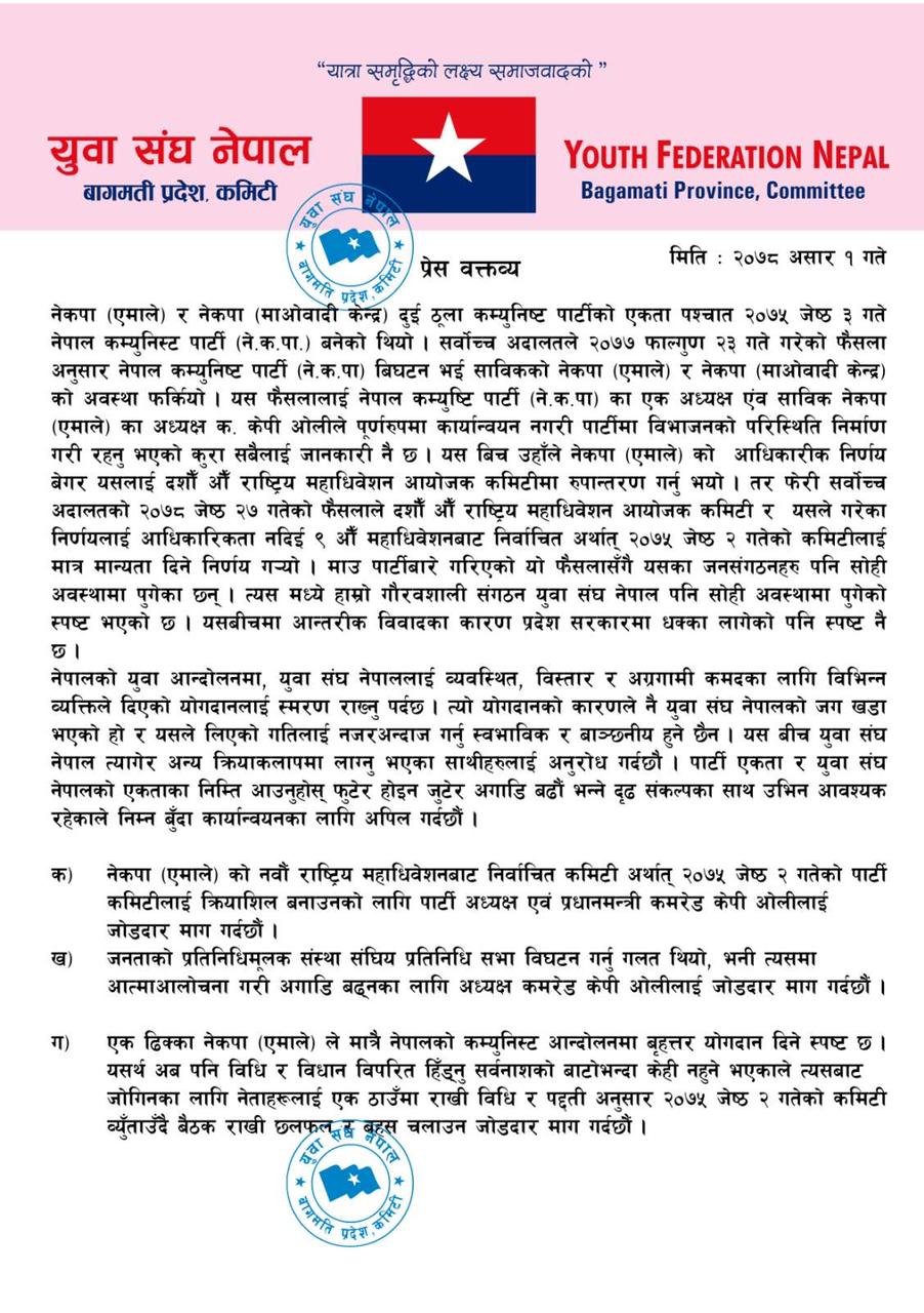 मंगलबार विज्ञप्ति जारी गरी युवा संघले प्रतिनिधिसभा विघटन गर्नु गलत भएको भन्दै आत्मालोचना गरेर अघि बढ्न प्रधानमन्त्रीलाई सुझाव दिएको हो ।
