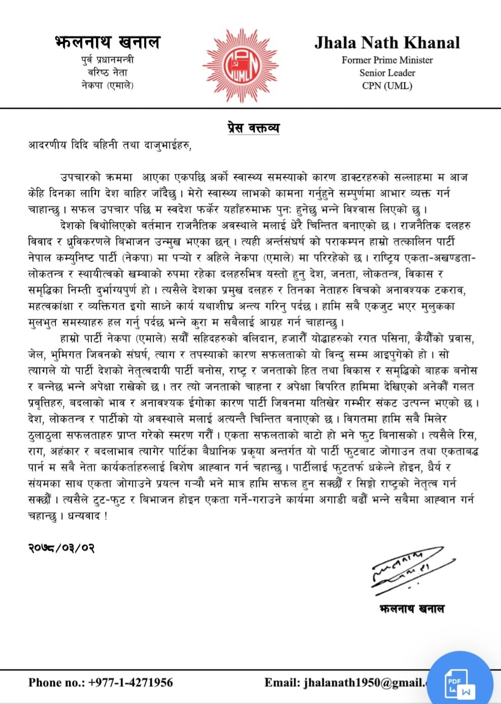 स्वास्थ्य उपचारका लागि भारतको नयाँदिल्ली जानुअघि बुधबार विज्ञप्ति जारी गरी वरिष्ठ नेता खनालले देशको विथोलिएको वर्तमान राजनैतिक अवस्थाले आफूलाई धेरै चिन्तित बनाएको भन्दै पार्टीलाई फुट हुनबाट जोगाउन नेता कार्यकर्तालाई आह्वान गरेका हुन् ।