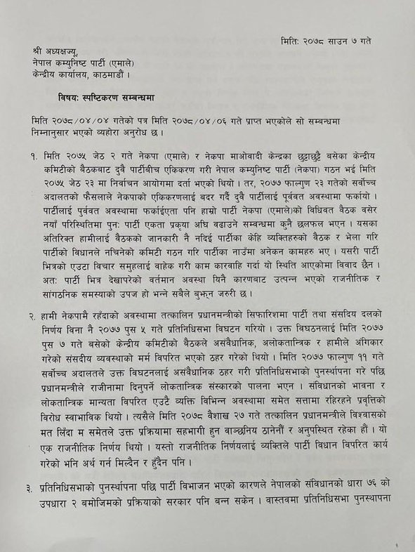 स्पष्टीकरणमा संसदबाट विश्वासको मत नपाएको अवस्था र प्रतिनिधिसभा पुनःस्स्थापना भएपछि पनि ओलीले एमाले संसदीय दलको नेताबाट राजीनामा नदिएकाले विद्रोह गर्नुपरेको बताएका छन् । उनीहरुले ओलीले संसदमा असफल भइसक्दा पनि पटक पटक आफैं प्रधानमन्त्री बन्न खोजेपछि कांग्रेस सभापति देउवालाई सघाउनुपरेको तर्क गरेका छन्।