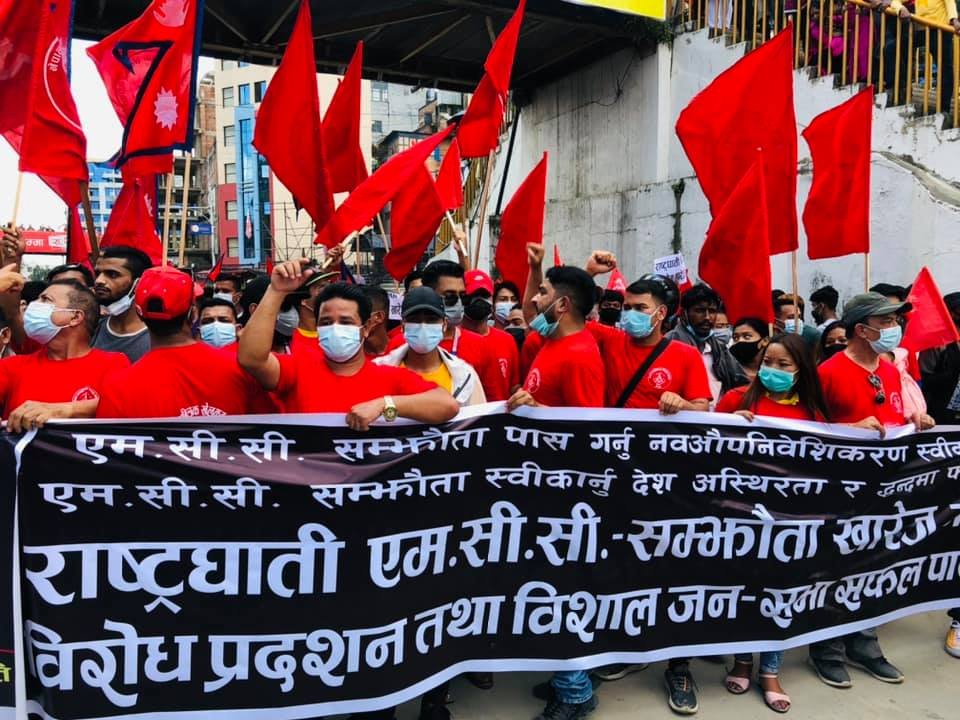 उनीहरुले एमसीसी सम्झौता स्वीकार्दा देश अस्थिरतामा फस्ने भन्दै सम्झौता खारेजीको माग गर्दै नाराबाजी गरेका छन् । एमसीसी सम्झौता संसदबाट अनुमोदन गर्न नहुने भन्दै विभिन्न राजनीतिक दल र समूहले निरन्तर प्रदर्शन गर्दै आएका छन् ।