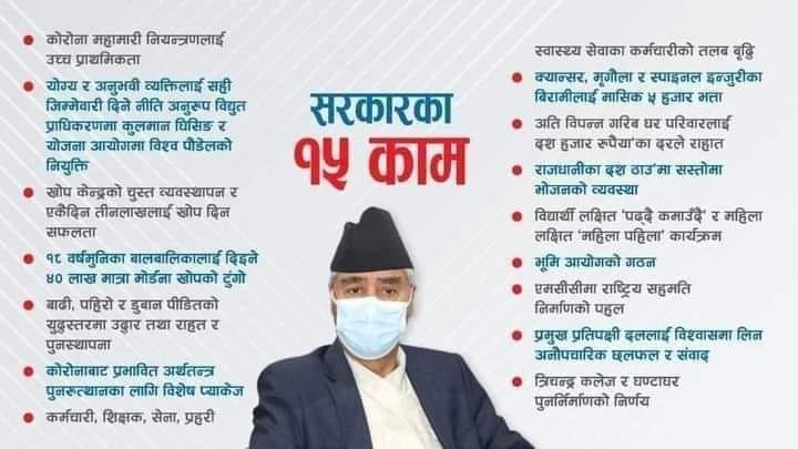 प्रधानमन्त्री देउवाको सचिवालयले शनिबार सरकारका १५ कामको सूची सार्वजनिक गरेको हो । पाँच दलीय गठबन्धनको समर्थनमा सरकारको नेतृत्व गरेका देउवाले ६ जनाको मन्त्रिमण्डल बनाएपनि दुई महिना वितिसक्दा पनि मन्त्रिपरिषद्लाई पूर्णता दिन सकेका छैनन् ।