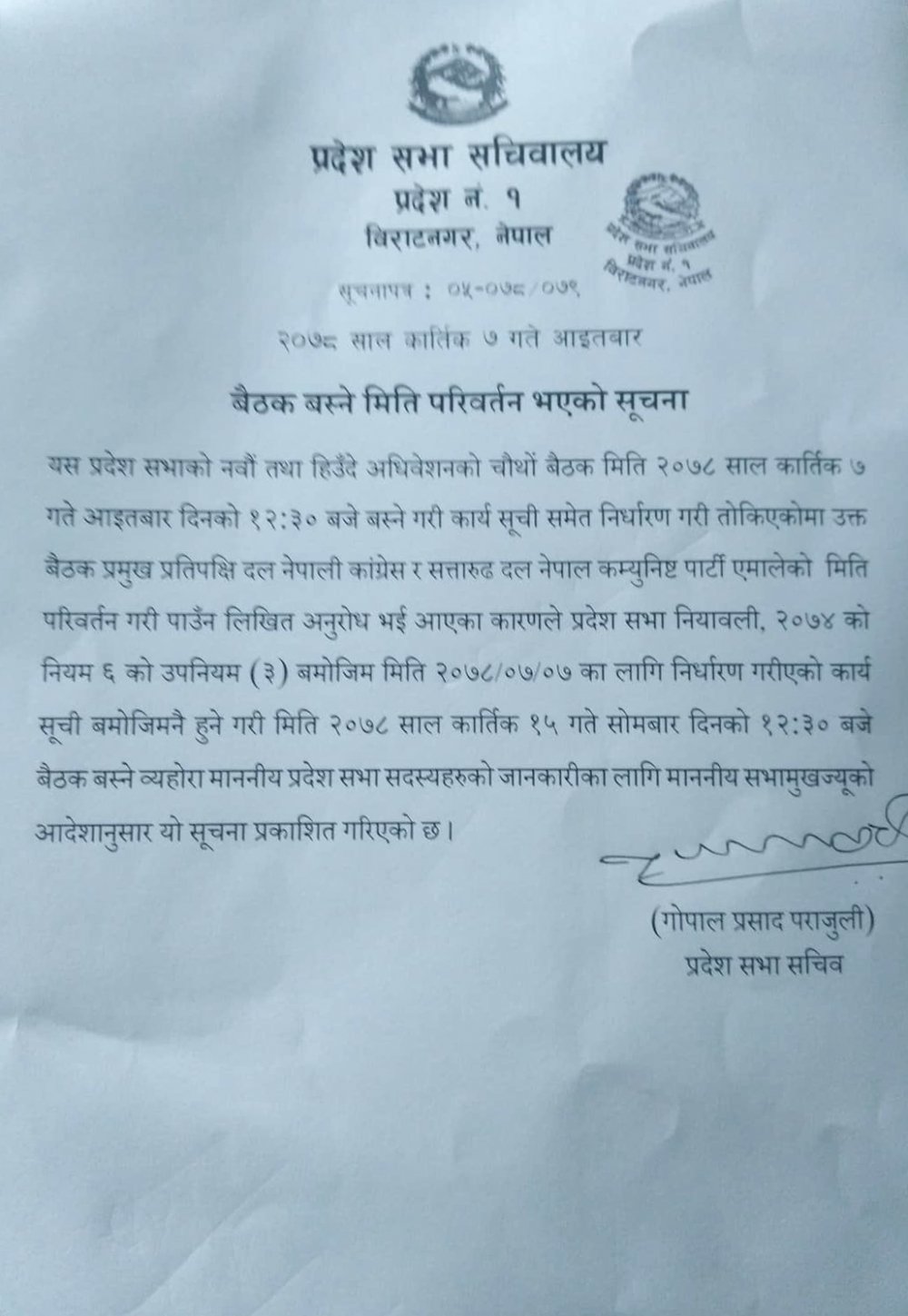 विराटनगर । प्रदेश एकको प्रदेशसभा बैठक कात्तिक १५ गते बस्ने भएको छ । आइतबार मध्यान्ह साढे १२ बजेका लागि बोलाइएको बैठक नेकपा एमाले र नेपाली कांग्रेसले संसद् बैठक स्थगित गर्न निवदेन दिएपछि कात्तिक १५ गते सोमबार मध्यान्ह साढे १२ बजे बस्ने गरी स्थगित गरिएको हो । मुख्यमन्त्री भीम आचार्यले आइतबार विश्वासको मत लिने कार्यसूची थियो ।