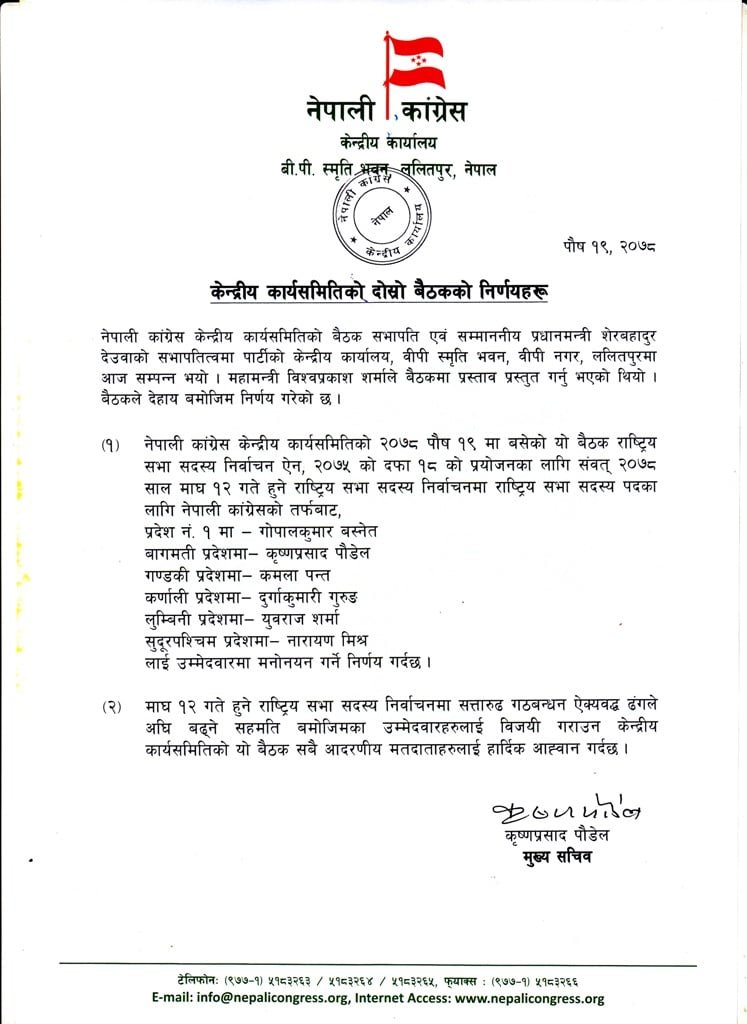 काठमाडौं । नेपाली कांग्रेसले राष्ट्रियसभा सदस्यका लागि पार्टीका तर्फबाट उम्मेदवार चयन गरेको छ । पार्टी केन्द्रीय कार्यालयमा सोमबार बसेको केन्द्रीय समितिको बैठकले प्रदेश नं. १ मा गोपालकुमार बस्नेत, बागमती प्रदेशमा कृष्णप्रसाद पौडेल, गण्डकी प्रदेशमा कमला पन्त, कर्णाली प्रदेशमा दुर्गाकुमारी गुरुङ, लुम्बिनी प्रदेशमा युवराज शर्मा र सुदूरपश्चिम प्रदेशमा नारायण मिश्रलाई उम्मेदवार बनाउने निर्णय गरेको हो ।
