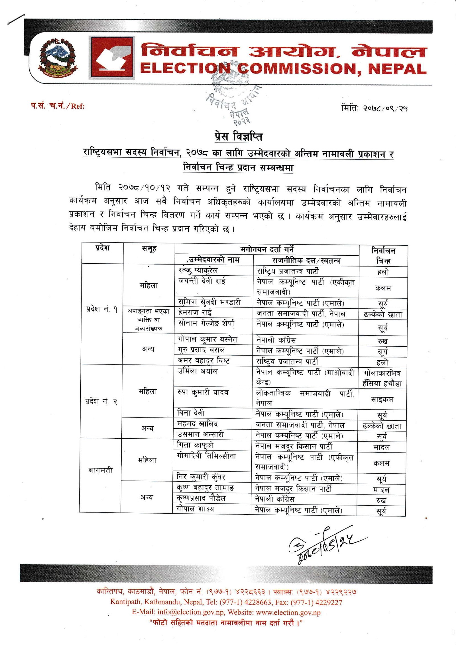 काठमाडौं । राष्ट्रियसभा निर्वाचनका लागि उम्मेदवारको अन्तिम नामावली प्रकाशित भएको छ । निर्वाचन आयोगले आइतबार उम्मेदवारहरुको अन्तिम नामावली प्रकाशित गरेको हो । यससँगै आयोगले उम्मेदवारहरूलाई चुनाव चिन्ह पनि प्रदान गरेको छ ।
