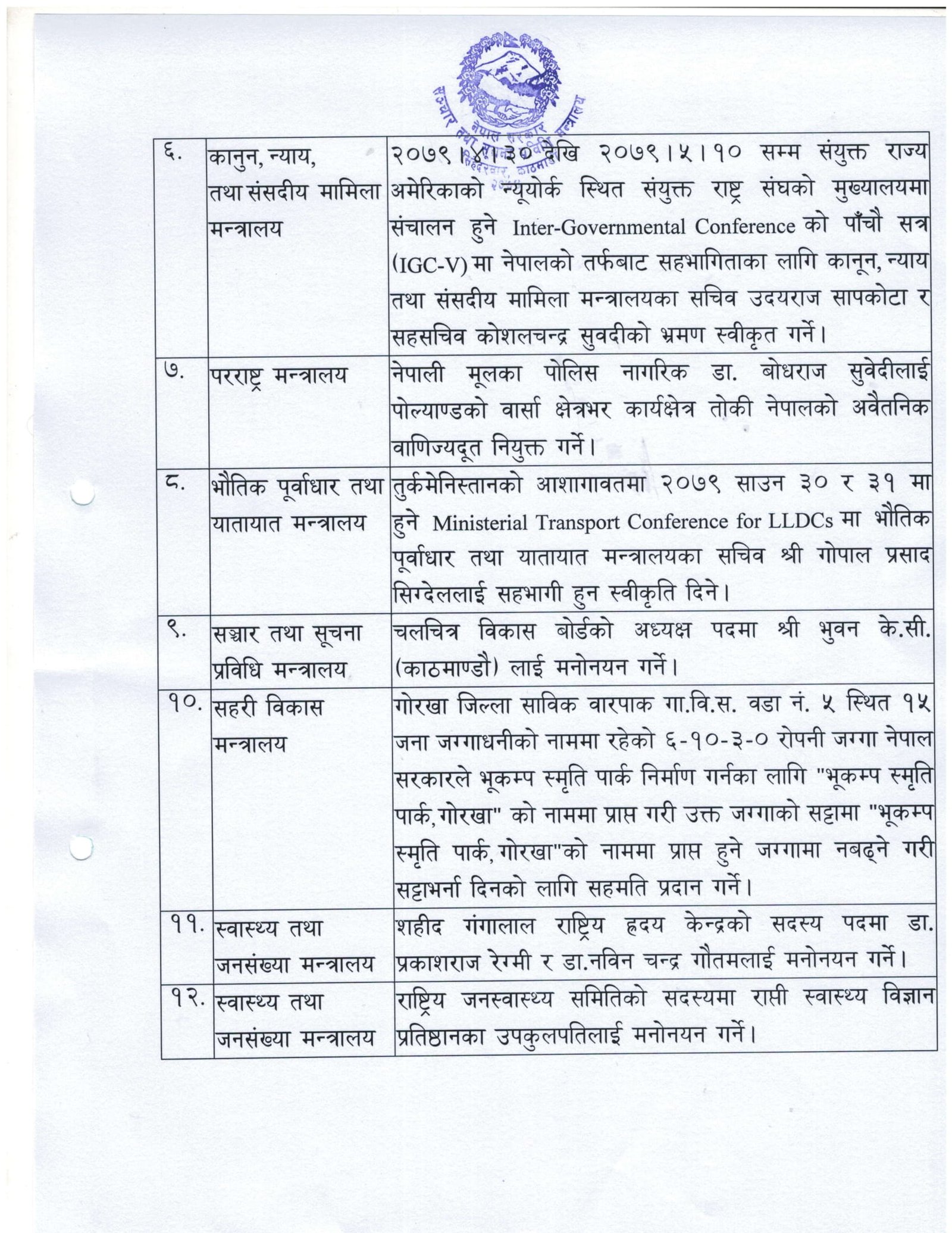 बैठकले चलचित्र विकास बोर्डको अध्यक्षमा भुवन केसीलाई मनोनयन नियुक्ति गर्ने निर्णय गरेको छ । त्यस्तै शहीद गंगालाल राष्ट्रिय हृदय केन्द्रको सदस्यमा डा. प्रकाशराज रेग्मी र डा. नविनचन्द्र गौतमलाई मनोनयन गर्ने निर्णय पनि बैठकले गरेको छ ।