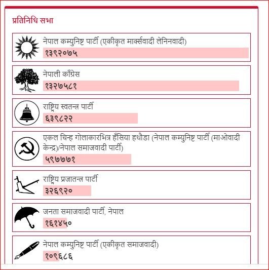 शुक्रबार साँझ सात बजेसम्मको मतपरिणाम विवरणअनुसार एमालेले १३ लाख ९२ हजार ७५ मत प्राप्त गरेको छ । दोस्रो स्थानमा रहेको नेपाली कांग्रेसको १३ लाख २७ हजार ५८१ मत प्राप्त गरेको छ ।