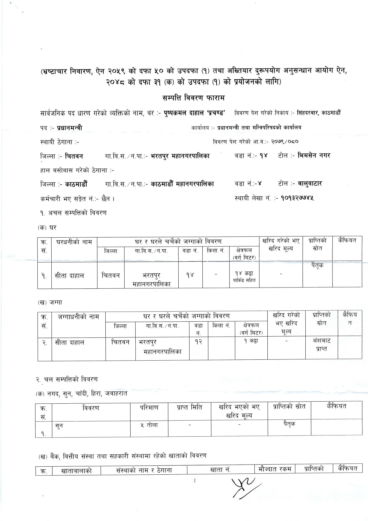 प्रधानमन्त्रीको सम्पत्ति २५ लाख नगद, १४ कठ्ठा जग्गा र पाँच तोला सुन