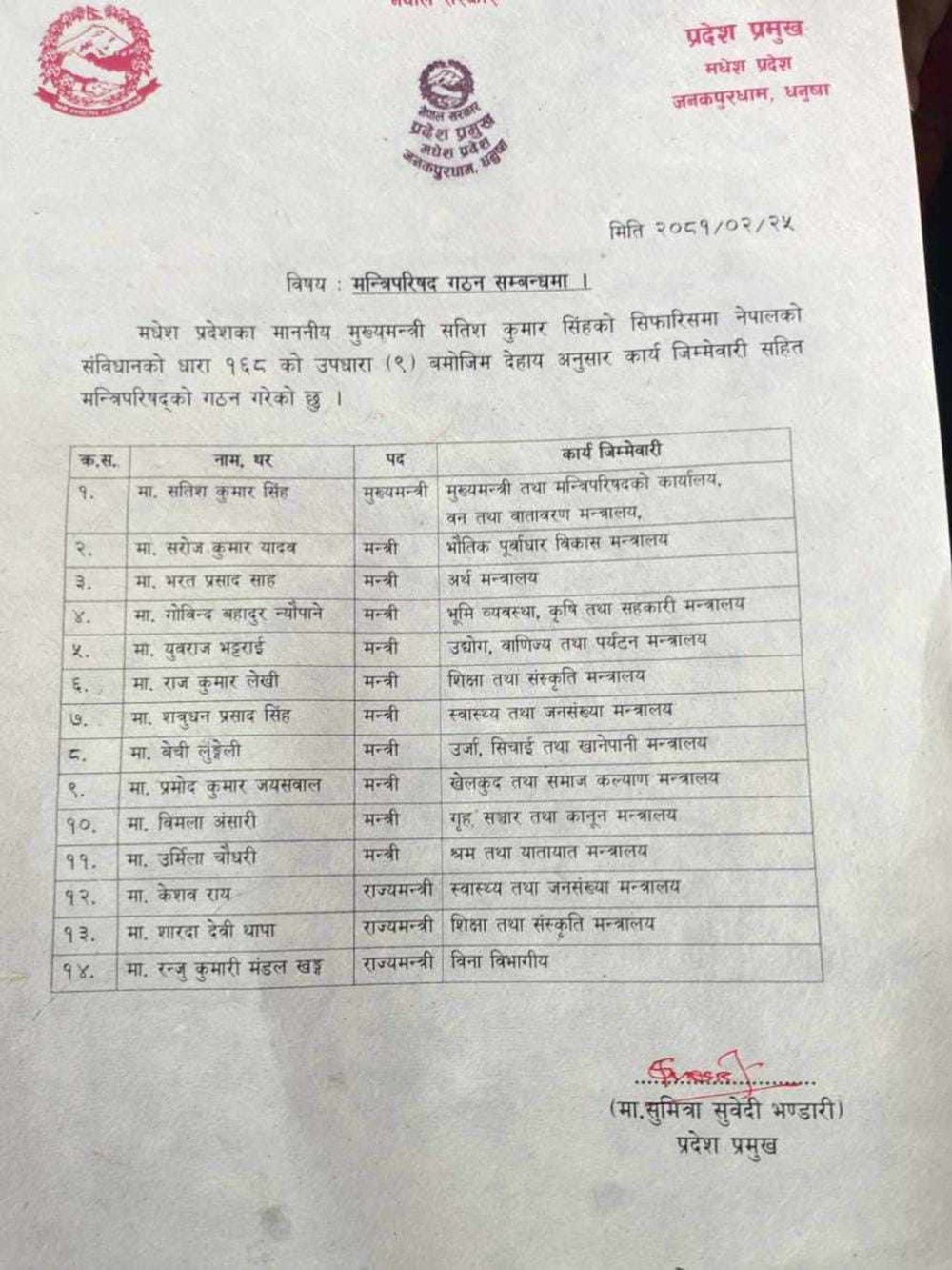 नेकपा (एकीकृत समाजवादी) का तर्फबाट संसदीय दलका नेता नेता गोविन्दबहादुर न्यौपाने भूमि व्यवस्था, कृषि तथा सहकारीमन्त्री, बेची लुङ्गेली ऊर्जा, सिँचाइ र खानेपानीमन्त्री, नेपाल सङ्घीय समाजवादी पार्टीका तर्फबाट विमला अन्सारी गृह, सञ्चार तथा कानुनमन्त्री र नागरिक उन्मुक्ति पार्टीकी उर्मिलादेवी सिंहलाई श्रम तथा यातायातमन्त्रीको जिम्मेवारी दिइएको छ ।