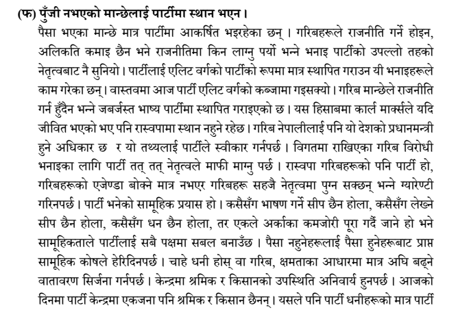 प्रतिवेदनमा उनले पुँजी नभएको मान्छेलाई पार्टीमा स्थान नभएको उल्लेख गरेका छन् । ढकालले पार्टीलाई एलिट वर्गको पार्टीको रूपमा मात्र स्थापित गराउने काम भएको प्रतिवेदनमा उल्लेख गरेका छन् ।