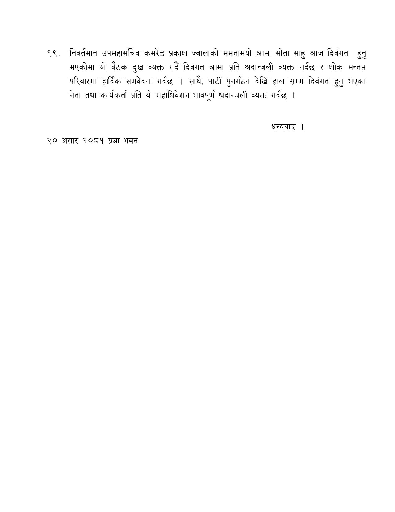 तीनै जना वरिष्ठ उपाध्यक्षको दाबीबाट टसमस नभएपछि सहमति जुट्न नसकेको हो । ९३ जना केन्द्रीय सदस्यहरूले भने शुक्रबार पद तथा गोपनीयताको शपथ ग्रहण गरेका छन् । महाधिवेशनले १९ बुँदे प्रस्ताव पारित गरेको छ ।