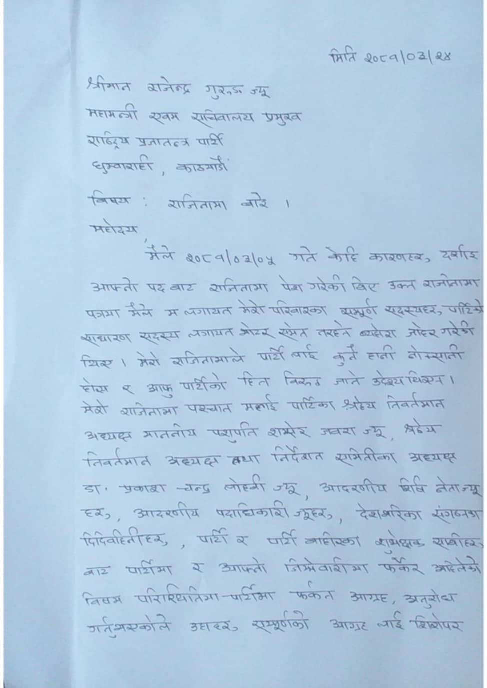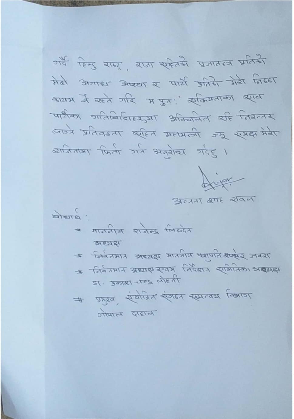 ‘म लगायत मेरो परिवार सम्पूर्ण साधारण सदस्य समेत नरहनेगरी राजीनामा दिएका थियौँ । तर पूर्वअध्यक्ष पशुपति शमशेर जबरा र डा. प्रकाशचन्द्र लोहनीलगायतको आग्रहमा पार्टीमा फर्किन लागेकी छु।’ उनले भनेकी छन्, ‘देशभरीका साथीहरूको आग्रह र हिन्दु राष्ट्र, राजासहितको प्रजातन्त्रको आगाध मायाले सक्रिय बन्न लागेकी हुँ।’