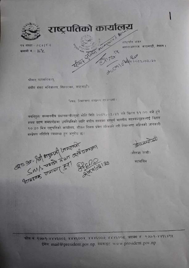 राष्ट्रपति कार्यालयले प्रधानमन्त्री नियुक्त नहुँदै सोमबार बिहान ११ बजे हुने प्रधानमन्त्रीको शपथ समारोहमा सहभागी हुन संसद् सचिवालयमार्फत सांसदहरूलाई निम्तो पठाएको हो ।
