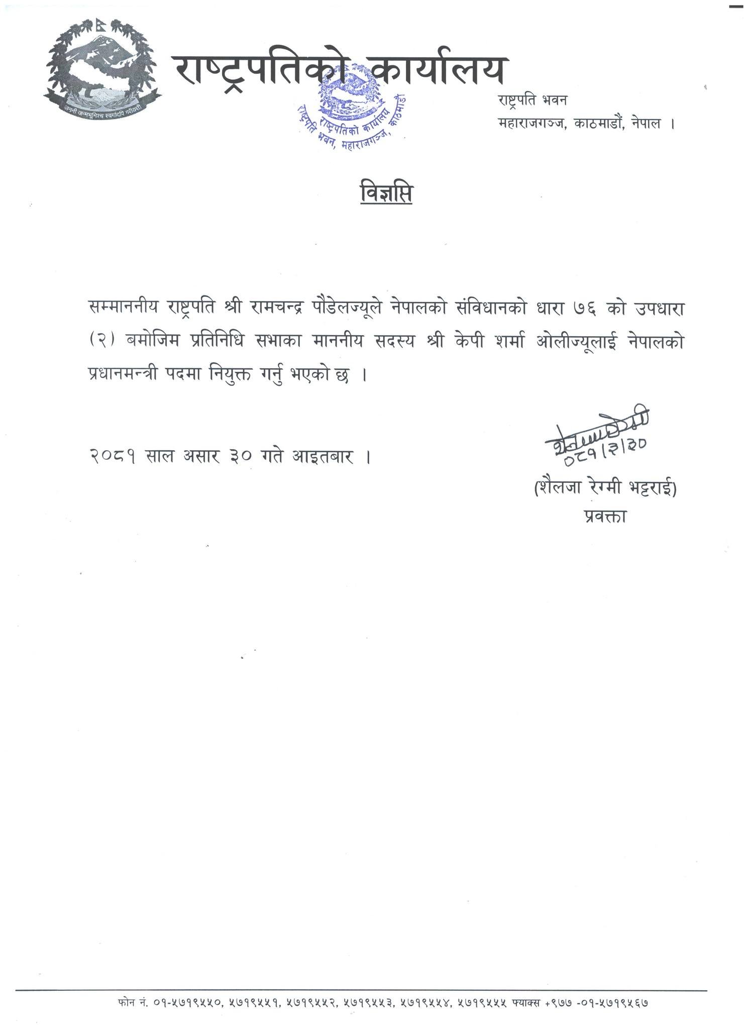 केपी ओली चौथो पटक प्रधानमन्त्रीमा नियुक्त