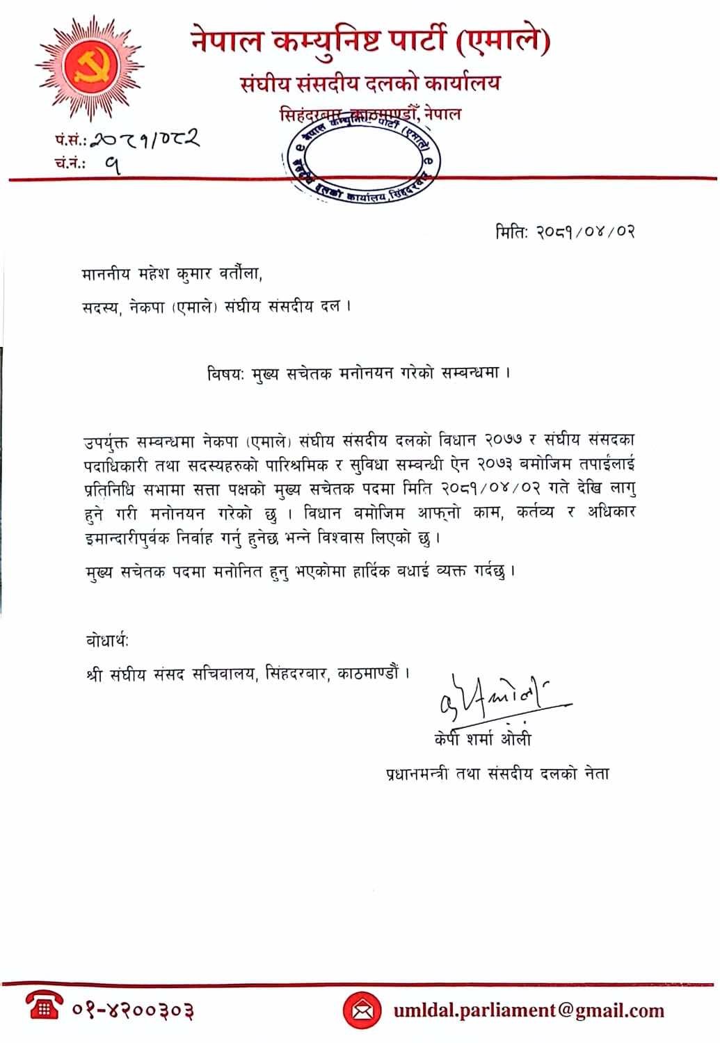 नेकपा एमाले संसदीय दलको विधान २०७७ र सङ्घीय संसद्का पदाधिकारी तथा सदस्यहरूको पारिश्रमिक र सुविधा पाउने गरी बर्तौलालाई प्रतिनिधि सभामा मुख्य सचेतक पदमा साउन २ गतेबाट लागू हुनेगरी मनोनयन गरेको हो ।