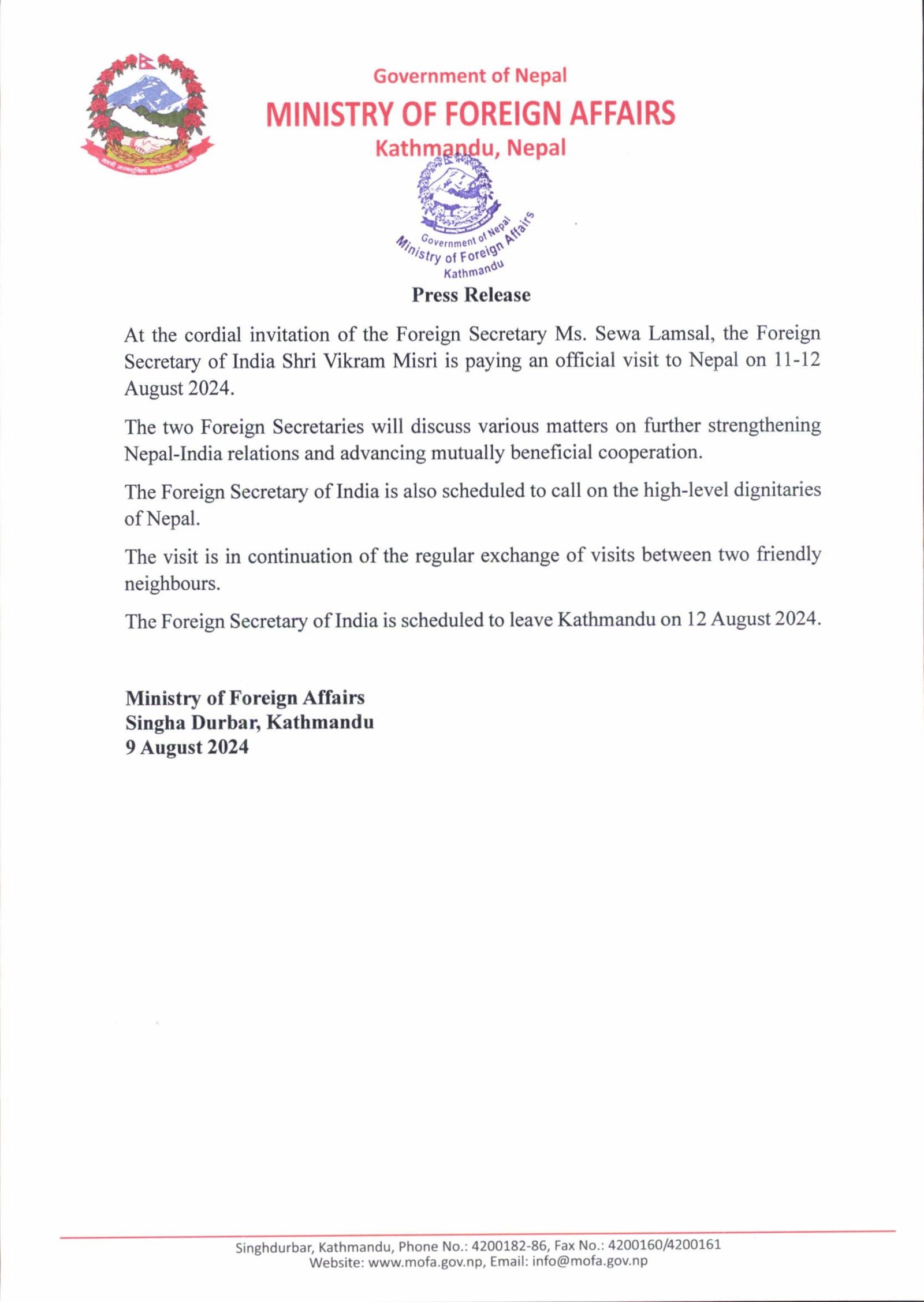 विदेश सचिवले नेपाल–भारत सम्बन्धलाई थप सुदृढ बनाउने र पारस्परिक हितकारी सहयोगलाई अगाडि बढाउने विषयमा छलफल गर्ने परराष्ट्र मन्त्रालयले जनाएको छ।भ्रमणका क्रममा उनले उच्चस्तरीय राजनीतिक भेटवार्ता गर्नेछन् ।