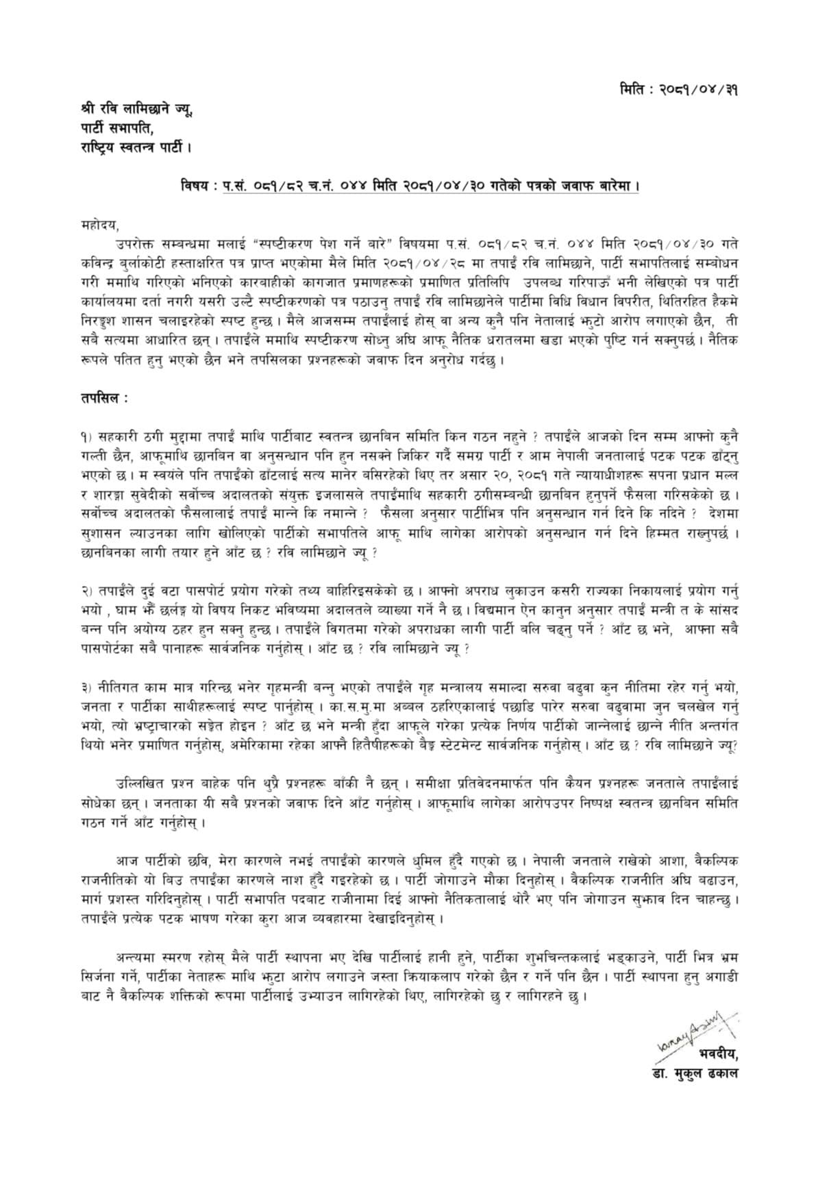 काठमाडौं । राष्ट्रिय स्वतन्त्र पार्टीका नेता डा. मुकुल ढकालले पार्टीले सोधेको स्पष्टीकरणको जवाफ दिएका छन् । बुधबार पार्टीले सोधेको स्पष्टीकरणको जवाफ उनले बिहीबार पार्टी सभापति रवि लामिछानेलाई सम्बोधन गरी लिखित रूपमा जवाफ पठाएका हुन् ।