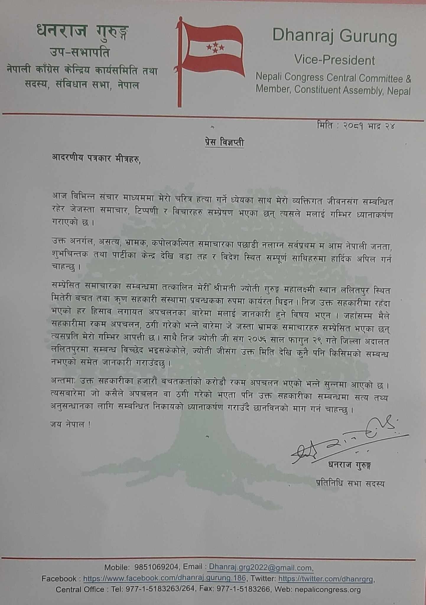 काठमाडौं । नेपाली कांग्रेसका उपसभापति धनराज गुरुङले आफूले सहकारी संस्थाको बचत रकम ठगी र हिनामिना नगरेको बताएका छन् ।