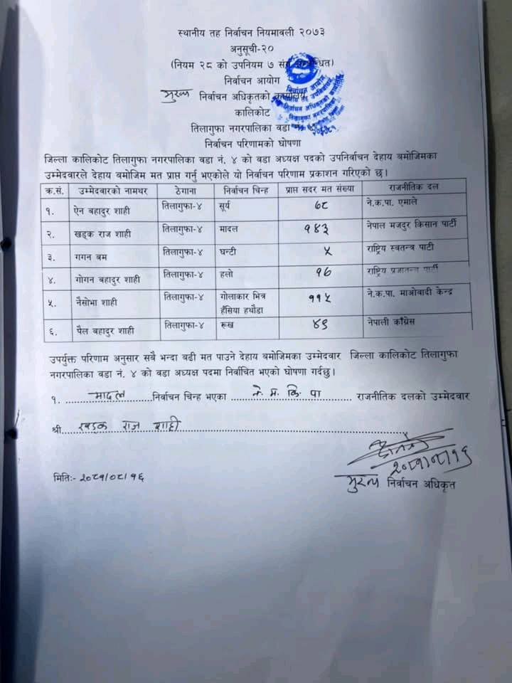 कालीकोटको तिलागुफा–४ को वडाध्यक्षमा नेमकिपाका शाही निर्वाचित