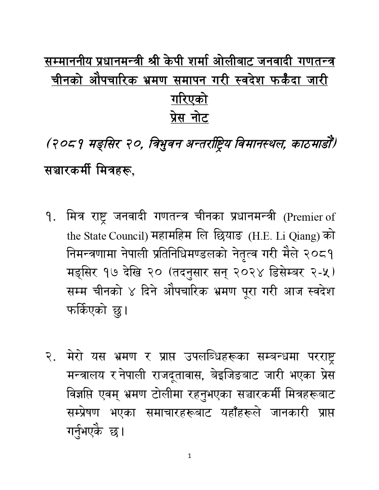 यस्तो छ चीन भ्रमणबारे प्रधानमन्त्री ओलीको १४ बुँदे ‘प्रेस नोट’