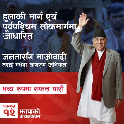 काठमाडौं । नेकपा माओवादी केन्द्रको तराई मधेश जागरण अभियान आजबाट झापाबाट सुरु हुँदैछ । पार्टी अध्यक्ष पुष्पकमल दाहाल (प्रचण्ड) ले उक्त अभियान झापाको कचनकवलबाट सुरु गर्दैछन् ।