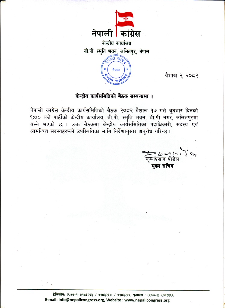 बैठकमा केन्द्रीय कार्यसमितिका पदाधिकारी, सदस्य एवं आमन्त्रित सदस्यहरूलाई उपस्थितिका लागि मुख्य सचिव कृष्णप्रसाद पौडेलले आग्रह गरेका छन् । पछिल्लो समय सरकारका कामकारबाहीलाई लिएर कांग्रेस नेताहरु असन्तुष्ट छन् ।
