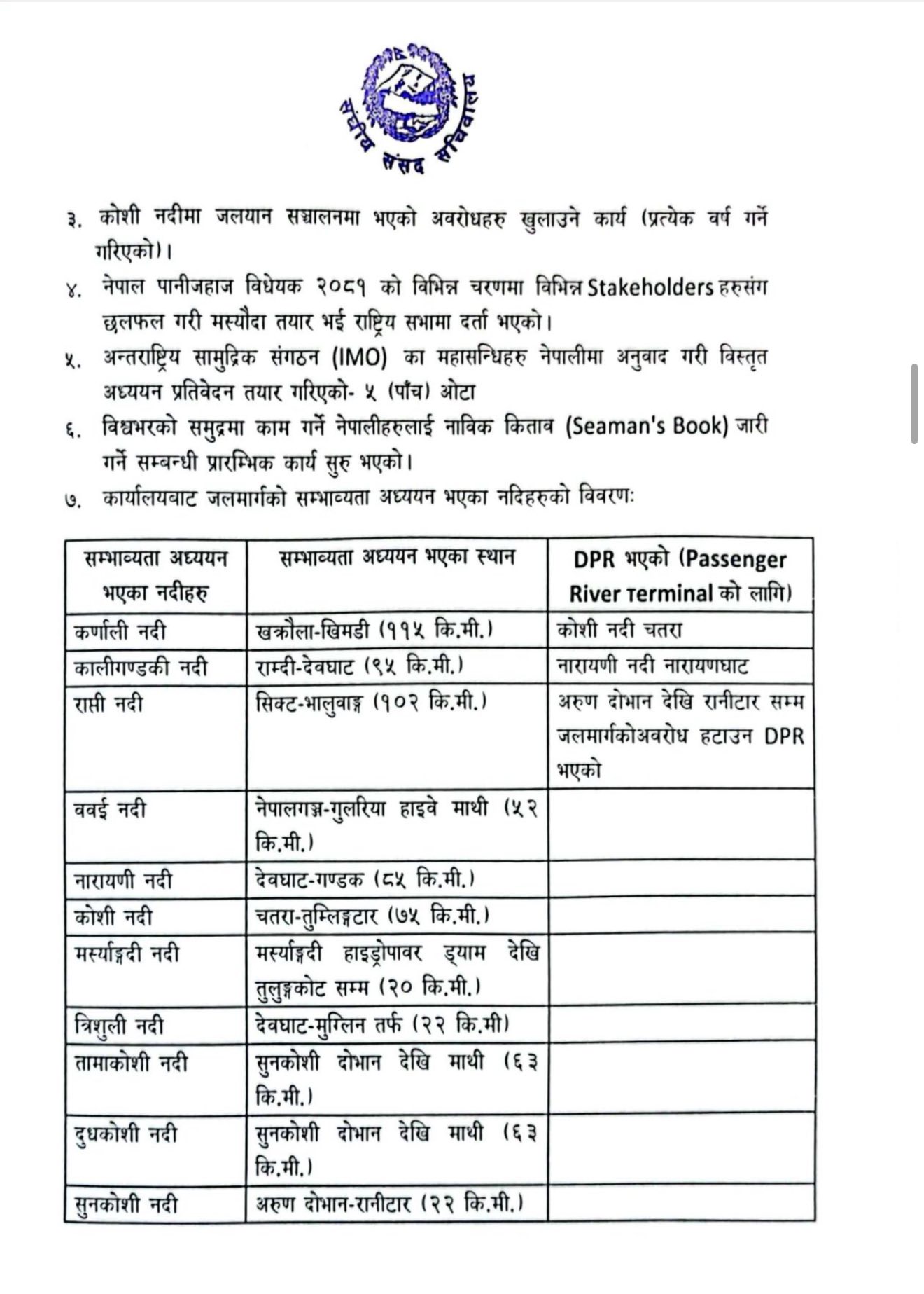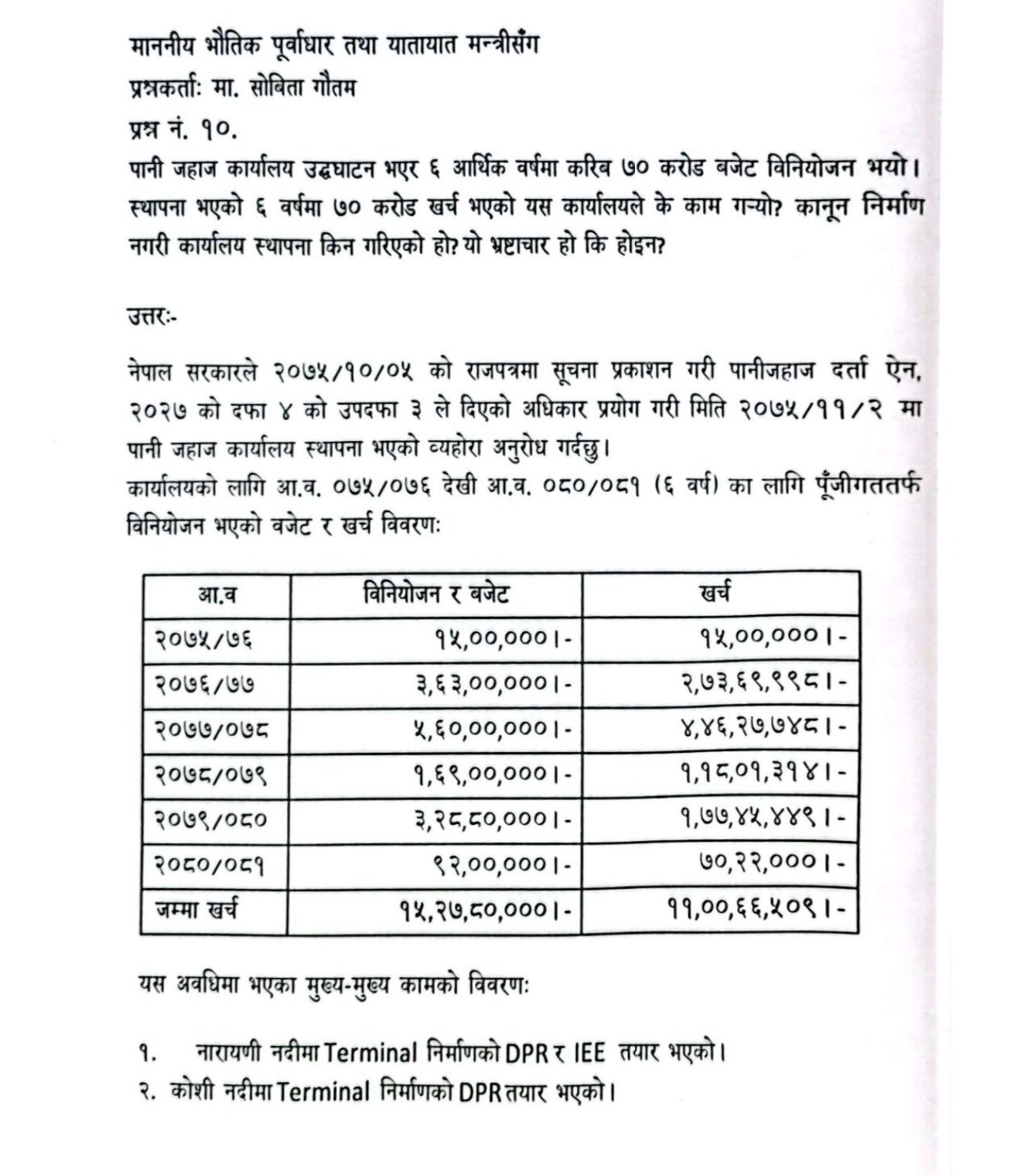 गौतमको जवाफमा मन्त्रालयले पानी जहाज कार्यालय स्थापनापछि नारायणी नदीमा टर्मिनल निर्माणको डीपीआर र आईईई तयार हुनुका साथै कोशी नदीमा टर्मिनल निर्माणको डीपीआर तयार भएको बताएको छ ।