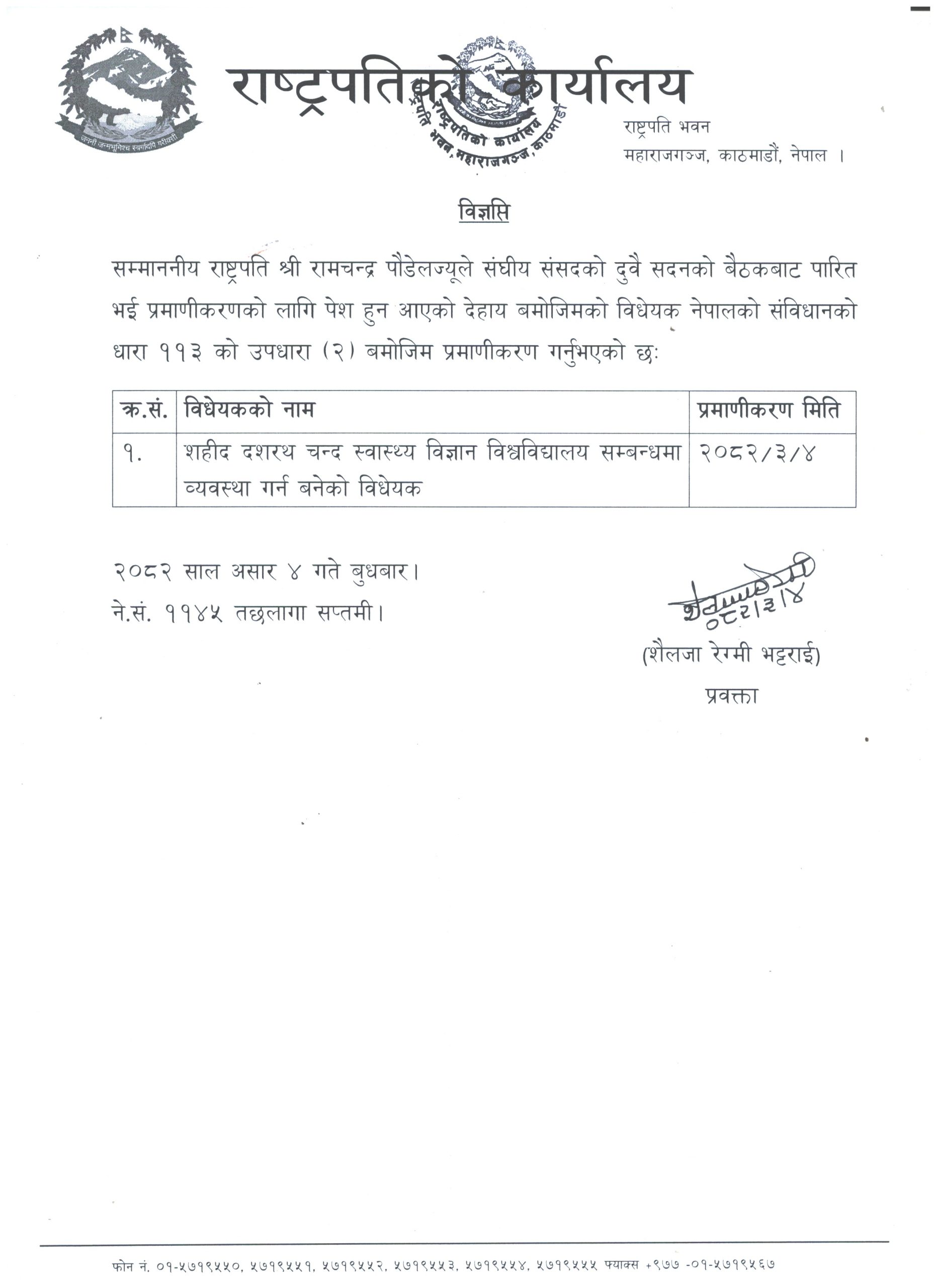 दशरथ चन्द स्वास्थ्य विज्ञान विश्वविद्यालय सम्बन्धी विधेयक राष्ट्रपतिबाट प्रमाणीकरण