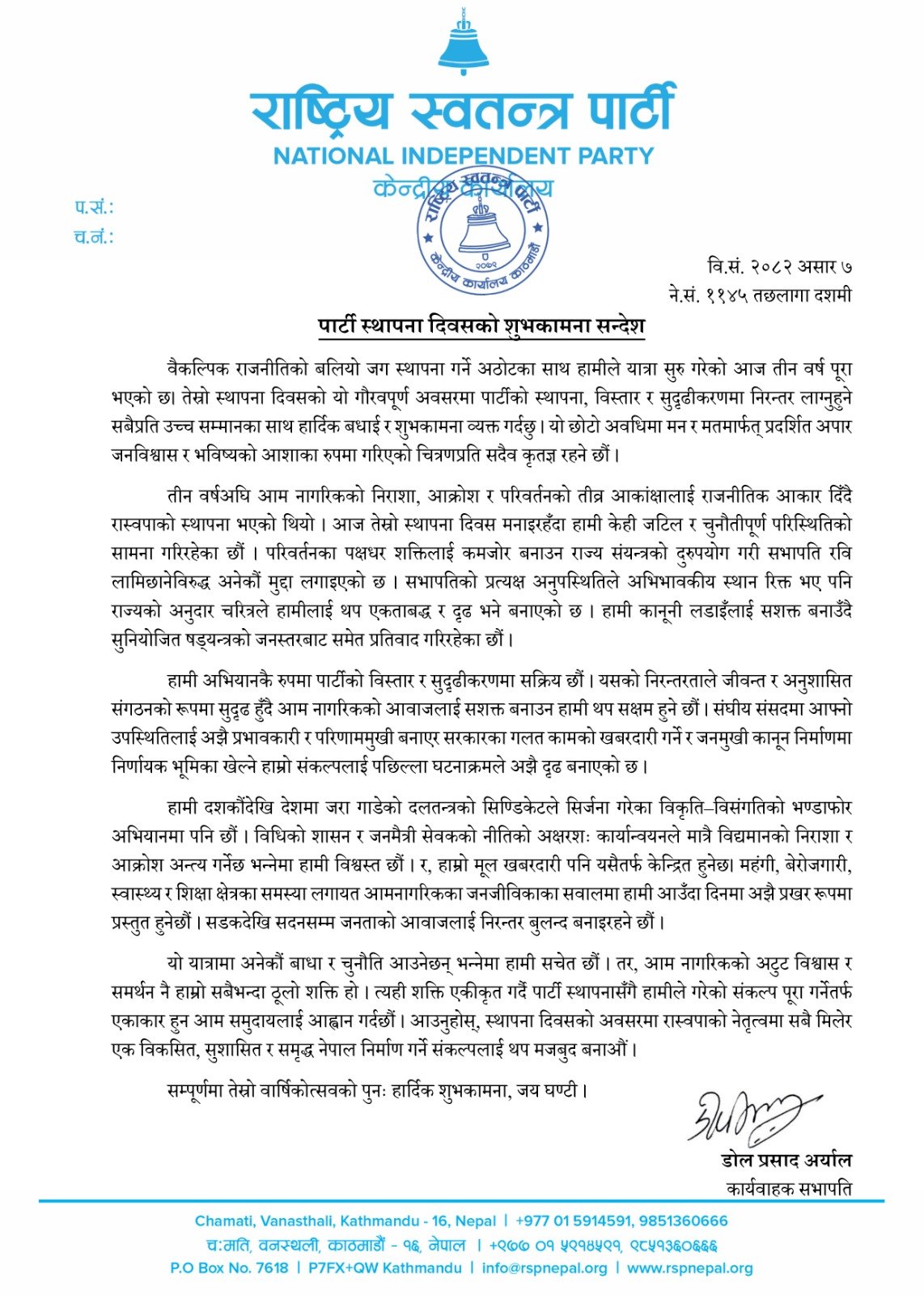 पार्टीको तेस्रो स्थापना दिवसको अवसरमा शुभकामना सन्देश दिँदै अर्यालले संघीय संसदमा आफ्नो उपस्थितिलाई अझै प्रभावकारी र परिणाममुखी बनाएर सरकारका गलत कामको खबरदारी गर्ने र जनमुखी कानून निर्माणमा निर्णायक भूमिका खेल्ने हाम्रो संकल्पलाई पछिल्ला घटनाक्रमले अझै दृढ बनाएको उल्लेख गरेका हुन् ।