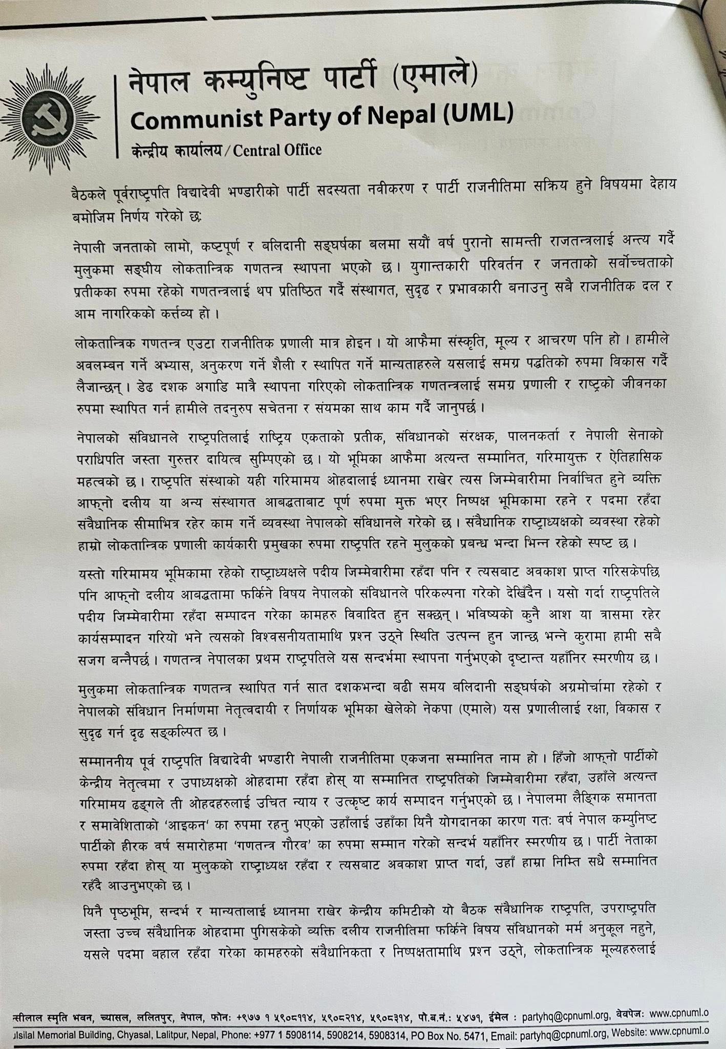 उनले पूर्वराष्ट्रपति राजनीतिमा फर्किनु उचित हुँदैन भन्ने निष्कर्ष निकालीसकेपछि सदस्यताको विषय स्वतः निष्क्रिय भएको बताए । उनले पूर्वराष्ट्रपतिको फरक भूमिकाको केन्द्रीय कमिटीले नै महसुस गरेकाले भण्डारीलाई पार्टी सदस्य बनाउन नचाहेको बताए ।